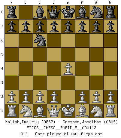 Last move : 0-1 2013 October 21 4:52:52 [Event "FICGS__CHESS__RAPID_E__000112"] [Site "FICGS"] [Date "2013.09.14"] [Round "1"] [White "Malish,Dmitriy"] [Black "Gresham,Jonathan"] [Result "0-1"] [WhiteElo "0862"] [BlackElo "0809"] 1.e4 Nc6 0-1 This chess game has been lost on time (started : 2013.09.14 10:2:50) KP : Nimzovich defense Player Black won this chess game. Follow this game move after move (download)Morphy was probably the greatest genius of them all. (Bobby Fischer) Mit sehr nachdenklichem Gesicht schreitet Bobby durch den Turniersaal. Was ist passiert?, fragt Lombardy. Ich stehe schlecht, antwortet Fischer. Lombardy: Dann biete doch einfach Remis an. Fischer: So schlecht stehe ich nun auch wieder nicht! (Robert James Fischer) No es suficiente ser un buen jugador, se debe también de jugar bién. (Siegbert Tarrasch) Je menace de comprendre la position. (Anonyme) Excelling at chess has long been considered a symbol of more general intelligence. That is an incorrect assumption in my view, as pleasant as it might be. But for the purposes of argument and investigation, chess is, in Russkin-Gutman's words, 'an unparalleled laboratory, since both the learning process and the degree of ability obtained can be objectified and quantified, providing an excellent comparative framework on which to use rigorous analytical techniques.' (The Chess Master and the Computer, by Garry Kasparov - 2010)