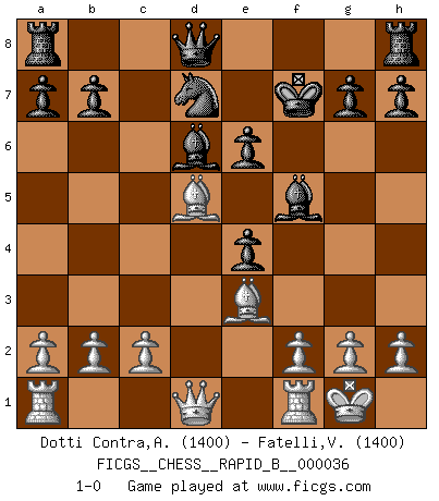 Last move : 1-0 2007 April 3 9:37:43 [Event "FICGS__CHESS__RAPID_B__000036"] [Site "FICGS"] [Date "2007.02.06"] [Round "1"] [White "Dotti Contra,Alessandro"] [Black "Fatelli,Vittorio"] [Result "1-0"] [WhiteElo "1400"] [BlackElo "1400"] 1.e4 c6 2.Nf3 d5 3.Nc3 dxe4 4.Ne5 Bf5 5.Bc4 e6 6.O-O Bd6 7.d4 Nd7 8.Nxf7 Kxf7 9.Be3 Ngf6 10.d5 cxd5 11.Nxd5 Nxd5 12.Bxd5 1-0 This chess game has been lost on time (started : 2007.02.06 2:54:37) Caro-Kann defense Kingside Castling by player White (move 6) Player White won this chess game. Follow this game move after move (download)Nonsense was the last thing Fischer was interested in, as far as Chess was concerned. (Elie Agur) Sie führen leise Selbstgespräche, schlürfen lautstark ihre Getränke, schmatzen hörbar beim Essen, blasen ihrem Gegenüber Rauch in die Augen, niesen ihm ins Gesicht, starren ihn unverwandt an, bis er sich unter ihren Blicken windet, rutschen ständig auf ihrem Stuhl hin und her, rülpsen und bohren in der Nase. (Anonymous) Dios mío, Bobby Fischer juega tan simple. (Alexei Suetin) C'est la seule position que je connaisse où les deux camps sont mals. Propos prêtés à V. Anand. Question: Is 'This statement is paradoxical' a paradoxical statement ? Or is it a meta-paradox ? (Normajean Yates)
