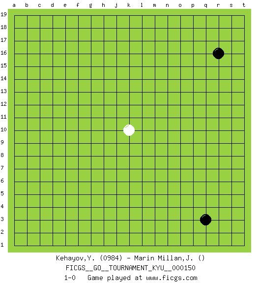 Last move : 1-0 2013 October 17 4:25:44 [Event "FICGS__GO__TOURNAMENT_KYU__000150"] [Site "FICGS"] [Date "2013.09.14"] [Round "1"] [Black "Kehayov,Yulian"] [White "Marin Millan,Jose Antonio"] [Result "1-0"] [Rating 1 "0984"] 1.r16 k10 2.q3 1-0 This go game has been lost on time (started : 2013.09.14 10:10:1) Here are the names of the openings (joseki) played in the four corners : Corner q4 : q3 1-0 Komoku (Somok, Xiao~mu`) 3-4 Point. The komoku (3-4) point is the traditional corner enclosure move.. Player Black won this Go (weiqi, baduk) game. Follow this game move after move (download)Connect with good shape. (Anonymous) To err is human, to shift the blame on someone else is tactical. (Mladen Jankovic)