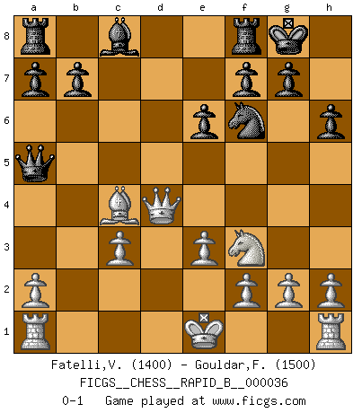Last move : 0-1 2007 April 3 9:37:43 [Event "FICGS__CHESS__RAPID_B__000036"] [Site "FICGS"] [Date "2007.02.06"] [Round "1"] [White "Fatelli,Vittorio"] [Black "Gouldar,Frances"] [Result "0-1"] [WhiteElo "1400"] [BlackElo "1500"] 1.d4 d5 2.Bg5 h6 3.Bh4 Nd7 4.Nf3 Ngf6 5.e3 e6 6.c4 Be7 7.Nc3 O-O 8.Qc2 c6 9.Be2 dxc4 10.Bxc4 Nd5 11.Bxe7 Qxe7 12.Qe4 Nxc3 13.bxc3 Nf6 14.Qd3 c5 15.dxc5 Qxc5 16.Qd4 Qa5 0-1 This chess game has been lost on time (started : 2007.02.06 2:54:37) Levitsky attack (Queen's Bishop attack) Kingside Castling by player Black (move 7) Player Black won this chess game. Follow this game move after move (download)One bad move nullifies forty good ones. (Horowitz) Es genügt nicht ein guter Spieler zu sein, man muß auch gut spielen. (Siegbert Tarrasch) El Ajedrez es un invernadero donde los frutos del carácter pueden madurar mas completamente que en la vida. (Edward Morgan Foster) Toutes les manuvres exécutées sur une colonne ouverte ont pour but ultime l'intrusion définitive sur la septième ou la huitième rangée, en plein cur de la position ennemie. (Aaron Nimzovitch) Horse racing is animated roulette. (Roger Kahn)