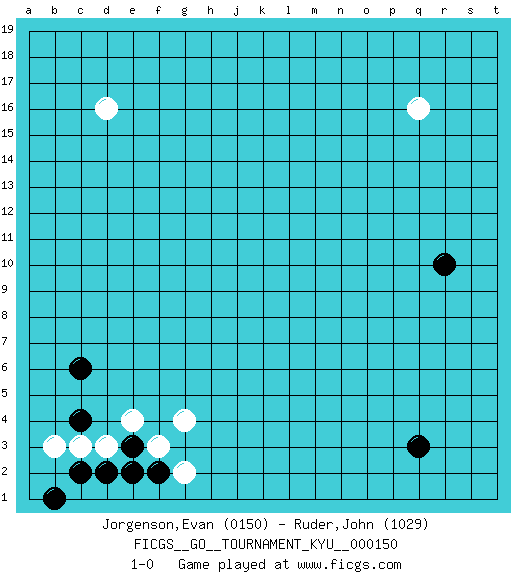 Last move : 1-0 2013 November 4 18:0:49 [Event "FICGS__GO__TOURNAMENT_KYU__000150"] [Site "FICGS"] [Date "2013.09.14"] [Round "1"] [Black "Jorgenson,Evan"] [White "Ruder,John"] [Result "1-0"] [Rating 1 "0150"] [Rating 2 "1029"] 1.q3 q16 2.c4 d16 3.r10 e4 4.e3 f3 5.e2 g4 6.f2 g2 7.c6 d3 8.d2 c3 9.c2 b3 10.b1 1-0 This go game has been lost on time (started : 2013.09.14 10:10:1) Here are the names of the openings (joseki) played in the four corners : Corner d4 : c4 e4 Komoku (Somok, Xiao~mu`) 3-4 Point. The komoku (3-4) point is the traditional corner enclosure move.. Ikken Takagakari (Hankan Nop'dakeolch'im, Yi Gaogua`jiao~, 1-Space High Approach). The 5-4 approach move has become more popular in modern times, as modern Go emphasizes speed and influence. Player Black won this Go (weiqi, baduk) game. Follow this game move after move (download)Take the cutting stone on the second line. (Anonymous) Philosophers use a language that is already deformed as though by shoes that are too tight. (Ludwig Wittgenstein)