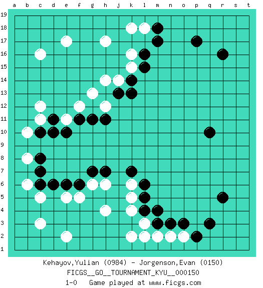 Last move : 1-0 2013 December 30 22:10:50 [Event "FICGS__GO__TOURNAMENT_KYU__000150"] [Site "FICGS"] [Date "2013.09.14"] [Round "1"] [Black "Kehayov,Yulian"] [White "Jorgenson,Evan"] [Result "1-0"] [Rating 1 "0984"] [Rating 2 "0150"] 1.r16 c3 2.q3 c16 3.p17 e17 4.r5 e2 5.q10 k2 6.m17 h17 7.m4 l3 8.m3 l2 9.l4 k4 10.l6 k5 11.l5 m2 12.n3 n2 13.o3 k18 14.m18 l18 15.l16 h4 16.d10 c11 17.d11 c12 18.c10 b10 19.c8 b6 20.c6 c5 21.d6 f5 22.f6 h6 23.h7 e5 24.e6 g6 25.g7 o2 26.p2 k16 27.l15 k6 28.k7 h14 29.k13 k15 30.k14 j14 31.j13 g13 32.g11 b8 33.c7 f12 34.f11 h12 35.h11 e11 36.e10 1-0 This go game has been lost on time (started : 2013.09.14 10:10:1) Here are the names of the openings (joseki) played in the four corners : Player Black won this Go (weiqi, baduk) game. Follow this game move after move (download)Win the early ko to win the game. (Anonymous) Animated gif is worth one mega-word. (Unknown)