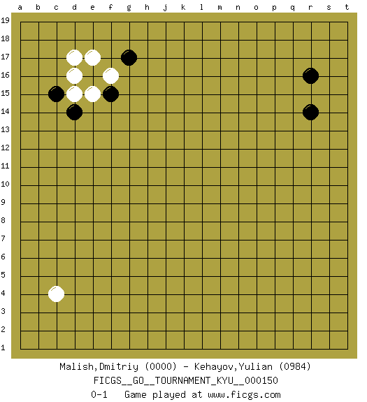 Last move : 0-1 2013 October 26 5:44:50 [Event "FICGS__GO__TOURNAMENT_KYU__000150"] [Site "FICGS"] [Date "2013.09.14"] [Round "1"] [Black "Malish,Dmitriy"] [White "Kehayov,Yulian"] [Result "0-1"] [Rating 1 "0000"] [Rating 2 "0984"] 1.r14 c4 2.r16 d17 3.e16 d16 4.c15 d15 5.d14 e15 6.f15 f16 7.g17 e17 0-1 This go game has been lost on time (started : 2013.09.14 10:10:1) Here are the names of the openings (joseki) played in the four corners : Corner d16 : d17 e16 Komoku (Somok, Xiao~mu`) 3-4 Point. The komoku (3-4) point is the traditional corner enclosure move.. Corner d4 : c4 0-1 Komoku (Somok, Xiao~mu`) 3-4 Point. The komoku (3-4) point is the traditional corner enclosure move.. Player White won this Go (weiqi, baduk) game. Follow this game move after move (download)If your stone is capped, play the knight's move. (Anonymous) Life is like internet, nothing interesting, but noone want to leave it. (Ilmars Cirulis)