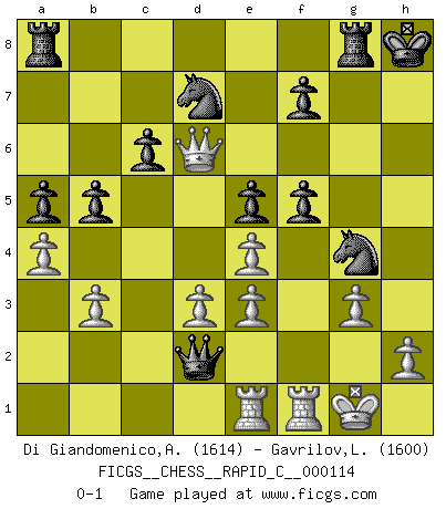 Last move : 0-1 2013 October 25 14:39:56 [Event "FICGS__CHESS__RAPID_C__000114"] [Site "FICGS"] [Date "2013.09.14"] [Round "1"] [White "Di Giandomenico,Alfonso"] [Black "Gavrilov,Lev"] [Result "0-1"] [WhiteElo "1614"] [BlackElo "1600"] 1.e4 e5 2.Bc4 Nf6 3.d3 Bc5 4.Nf3 d6 5.O-O O-O 6.Be3 Bxe3 7.fxe3 c6 8.Nbd2 Qb6 9.Qe1 Qxb2 10.Qg3 Qc3 11.Nh4 b5 12.Bb3 a5 13.a4 Be6 14.Ndf3 Nbd7 15.Ng5 Bxb3 16.cxb3 g6 17.Nf5 gxf5 18.Nxh7 Kxh7 19.Qh4+ Kg7 20.Qg5+ Kh8 21.Qh6+ Nh7 22.Qxd6 Nhf6 23.Rac1 Qd2 24.Rce1 Rg8 25.g3 Ng4 0-1 Bishop's Opening : Berlin defense Kingside Castling by player White (move 5) Kingside Castling by player Black (move 5) Player Black won this chess game. Follow this game move after move (download)When you are lonely, when you feel yourself an alien in the world, play Chess. This will raise your spirits and be your counselor in war. (Aristotle) Gegen einen Schachcomputer zu verlieren ist wie Löcher in den Strümpfen zuhaben. Es ist nicht peinlich, solange man der einzige ist der es weiß. (Anonymous) Es muy difícil jugar en contra de la teoría de Einstein. - en su primera derrota en contra de Fischer (Mikhail Tal) Mais n'est-ce pas déjà le limiter injurieusement que d'appeler les échecs un jeu? N'est-ce pas aussi une science, un art, ou quelque chose qui, comme le cercueil de Mahomet entre ciel et terre, est suspendu entre l'un et l'autre, et qui réunit un nombre incroyable de contraires ? (Stefan Zweig) After growing wildly for years, the field of computing appears to be reaching its infancy. (John Pierce)