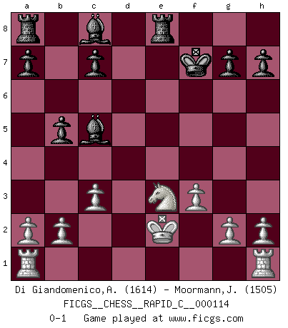 Last move : 0-1 2013 October 4 13:39:37 [Event "FICGS__CHESS__RAPID_C__000114"] [Site "FICGS"] [Date "2013.09.14"] [Round "1"] [White "Di Giandomenico,Alfonso"] [Black "Moormann,Joerg"] [Result "0-1"] [WhiteElo "1614"] [BlackElo "1505"] 1.e4 e5 2.Bc4 Nf6 3.d3 Nc6 4.c3 Na5 5.Nd2 Nxc4 6.Nxc4 d5 7.exd5 Qxd5 8.Nf3 e4 9.Nfe5 b5 10.Nxf7 Kxf7 11.Ne3 Qxd3 12.Qxd3 exd3 13.Kd2 Ne4+ 14.Ke1 Bc5 15.f3 d2+ 16.Bxd2 Nxd2 17.Kxd2 Rd8+ 18.Ke2 Re8 0-1 Bishop's Opening : Berlin defense Player Black won this chess game. Follow this game move after move (download)If your opponent cannot do anything active, then don't rush the position; instead you should let him sit there, suffer, and beg you for a draw. (Jeremy Silman) Ich bin der einzige Schachspieler, der sich während der Vorbereitungen zum Turnier verletzt hat. (Woody Allen) El Ajedrez es el juego mas altamente simbólico, pero las agresiones estan por lo tanto aún mas francamente representadas en la partida. Tal vez comenzo como un juego de guerra; Algo como la representación de una batalla en miniatura entre las fuerzas de dos reinos. (Karl Meninger) L'attaque fait le spectacle, la défense gagne les matchs. (Dicton footballistique) Employ the attack like tactic of defense. (Chinese proverb)