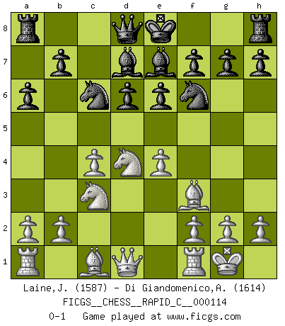 Last move : 0-1 2013 October 29 17:3:12 [Event "FICGS__CHESS__RAPID_C__000114"] [Site "FICGS"] [Date "2013.09.14"] [Round "1"] [White "Laine,Jari"] [Black "Di Giandomenico,Alfonso"] [Result "0-1"] [WhiteElo "1587"] [BlackElo "1614"] 1.e4 c5 2.Nf3 e6 3.d4 cxd4 4.Nxd4 d6 5.c4 a6 6.Nc3 Nf6 7.Be2 Be7 8.O-O Bd7 9.Bf3 Nc6 0-1 This chess game has been lost on time (started : 2013.09.14 18:22:7) Sicilian defense Kingside Castling by player White (move 8) Player Black won this chess game. Follow this game move after move (download)Bobby is the most misunderstood, misquoted celebrity walking the face of this earth. (Yasser Seirawan) Zeige mir drei Eröffnungsvarianten und ich beweise dir, dass zwei davon inkorrekt sind. (Emanuel Lasker) Después de una mala apertura, hay una esperanza en el juego medio. Pero una vez que estas en finales, el momento de la verdad ha llegado. (Edmar Mednis) Les réformistes prétendent que les progrès de la théorie conduiront à la disparition des échecs, et qu'il faut, pour leur rendre vie, en remanier les règles. En réalité, qu'exprime cette affirmation? Le mépris de l'intuition, de l'imagination et de tous les autres éléments qui font des échecs un art. (Alexander Alekhine) In my experience, there's no such thing as luck. (Obi-Wan Kenobi in Star Wars ep.4)