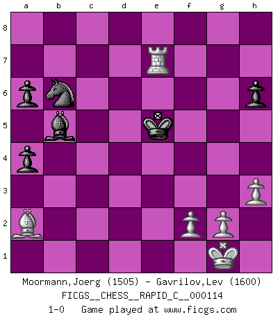 Last move : 1-0 2013 December 11 18:11:25 [Event "FICGS__CHESS__RAPID_C__000114"] [Site "FICGS"] [Date "2013.09.14"] [Round "1"] [White "Moormann,Joerg"] [Black "Gavrilov,Lev"] [Result "1-0"] [WhiteElo "1505"] [BlackElo "1600"] 1.e4 e5 2.Nf3 Nc6 3.Bb5 a6 4.Ba4 Nf6 5.O-O Bd6 6.c3 b5 7.Bc2 Bb7 8.d4 O-O 9.Nbd2 Re8 10.a4 exd4 11.cxd4 Be7 12.e5 Nd5 13.Ne4 Ncb4 14.Bb1 h6 15.Ng3 d6 16.e6 fxe6 17.Qe1 Bf6 18.Qe4 Kf8 19.Bd2 Nc6 20.Nh5 Qd7 21.Qg4 bxa4 22.Be4 Nce7 23.Nh4 Nf5 24.Nxf5 exf5 25.Bxf5 Qf7 26.Bg6 Qe6 27.Nxf6 Nxf6 28.Qh4 Reb8 29.Ra3 Qg4 30.Qxg4 Nxg4 31.Ba5 Bc6 32.Bxc7 Rxb2 33.Rc1 Bd7 34.h3 Nf6 35.Bxd6+ Kg8 36.Rc7 Rb3 37.Ra1 Rb2 38.d5 Re2 39.Rd1 Rd8 40.Ra7 Bb5 41.Be7 Rxe7 42.Rxe7 Rxd5 43.Rxd5 Nxd5 44.Ra7 Kf8 45.Rf7+ Kg8 46.Rb7 Kf8 47.Rf7+ Kg8 48.Rf3 Nb6 49.Bf7+ Kf8 50.Ba2 Ke7 51.Rf7+ Kd6 52.Rxg7 Ke5 53.Re7+ 1-0 Ruy Lopez : 5.O-O Kingside Castling by player White (move 5) Kingside Castling by player Black (move 8) Player White won this chess game. Follow this game move after move (download)A sacrifice is best refuted by accepting it. (Wilhelm Steinitz) Es ist schade, dass viele Schachsportler vergessen, wie wichtig Auftreten und angemessene Kleidung sind. (Alexandra Kosteniuk) Tu eres para mi la Reina en d8 y yo soy el Peón en d7!!. (GM Eduard Gufeld) Le temps de noter son nom sur la feuille de partie, j'étais déjà en zeitnot ! D'un modeste amateur apparié lors de la première ronde d'un open contre le grand-maître Azmaïparashvili. Humor is by far the most significant activity of the human brain. (Edward De Bono)