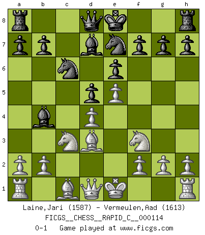 Last move : 0-1 2013 October 31 17:19:12 [Event "FICGS__CHESS__RAPID_C__000114"] [Site "FICGS"] [Date "2013.09.14"] [Round "1"] [White "Laine,Jari"] [Black "Vermeulen,Aad"] [Result "0-1"] [WhiteElo "1587"] [BlackElo "1613"] 1.e4 e6 2.d4 d5 3.e5 c5 4.c3 Nc6 5.Nf3 cxd4 6.cxd4 Bd7 7.Nc3 Bb4 8.Bd3 Nge7 0-1 This chess game has been lost on time (started : 2013.09.14 18:22:7) French : Advance, Paulsen attack Player Black won this chess game. Follow this game move after move (download)Your body has to be in top condition. Your Chess deteriorates as your body does. You can't separate body from mind. (Bobby Fischer) Offener Brief an US-Präsident Bush anlässlich der Verhaftung Bobby Fishers: Verhaften Sie mich. Stecken Sie mich in dieselbe Zelle wie Bobby Fisher und geben Sie uns ein Schachspiel mit. (Boris Vassilievich Spassky) En manos de Fischer's, una diminuta ventaja teórica es tan buena como tener una Reina de ventaja. (Isaac Kashdan) Vous savez, camarade Pachman, je n'éprouve pas de plaisir à être ministre, je jouerais plutôt aux échecs comme vous, ou alors ferais une révolution au Venezuela. (Che Guevara à Ludek Pachman, 'Checkmate in Prague', 1975) Art is the only way to run away without leaving home. (Twyla Tharp)