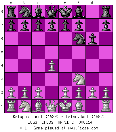 Last move : 0-1 2013 October 25 17:44:13 [Event "FICGS__CHESS__RAPID_C__000114"] [Site "FICGS"] [Date "2013.09.14"] [Round "1"] [White "Kalapos,Karol"] [Black "Laine,Jari"] [Result "0-1"] [WhiteElo "1639"] [BlackElo "1587"] 1.Nf3 Nf6 2.d4 g6 0-1 This chess game has been lost on time (started : 2013.09.14 18:22:7) Reti Opening Player Black won this chess game. Follow this game move after move (download)No price is too great for the scalp of the enemy King. (Koblentz) Ich habe Putins Aufstieg an die Macht beobachtet und seine Politik, die demokratischen Institutionen meines Landes zu zerstören. (Garry Kasparov) De eso se trata el Ajedrez. Un día le das una lección a tu oponente y al día siguiente el te da una a tí. (Bobby Fischer) Avec des compensations pour le matériel en plus... (Anonyme) Life doesn't imitate art, it imitates bad television. (Woody Allen)