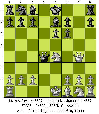 Last move : 0-1 2013 October 27 16:51:11 [Event "FICGS__CHESS__RAPID_C__000114"] [Site "FICGS"] [Date "2013.09.14"] [Round "1"] [White "Laine,Jari"] [Black "Kepinski,Janusz"] [Result "0-1"] [WhiteElo "1587"] [BlackElo "1656"] 1.e4 e6 2.d4 d5 3.Nd2 dxe4 4.Nxe4 Nf6 5.Bg5 Be7 6.Bxf6 gxf6 7.Qg4 Qxd4 0-1 This chess game has been lost on time (started : 2013.09.14 18:22:7) French : Tarrasch Player Black won this chess game. Follow this game move after move (download)Many Chess players were surprised when after the game, Fischer quietly explained: 'I had already analyzed this possibility' in a position which I thought was not possible to foresee from the opening. (Mikhail Tal) Die größte Kunst beim Schach besteht darin dem Gegner nicht zu zeigen was er tun kann. (Garry Kasparov) Cuando veas una buena jugada, trata de encontrar otra mejor. (Emanuel Lasker) Le jeu d'échecs est comme rejeté hors du temps. (Antoine de Saint-Exupéry) All war is based on deception. (Sun Tzu)