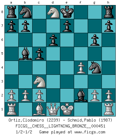 Last move : 1/2-1/2 2013 September 15 3:56:59 [Event "FICGS__CHESS__LIGHTNING_BRONZE__000451"] [Site "FICGS"] [Date "2013.09.15"] [Round "1"] [White "Ortiz,Clodomiro"] [Black "Schmid,Pablo"] [Result "1/2-1/2"] [WhiteElo "2239"] [BlackElo "1987"] 1.f4 g6 2.d4 Bg7 3.e4 d6 4.Nc3 Nf6 5.Nf3 c5 6.Bb5+ Bd7 7.e5 Ng4 8.e6 fxe6 9.Ng5 Bxb5 10.Nxe6 Bxd4 11.Nxd8 Bf2+ 12.Kd2 Be3+ 13.Ke1 Bf2+ 14.Kd2 Be3+ 15.Ke1 Bf2+ 1/2-1/2 Bird's Opening This chess game ended in a draw. Follow this game move after move (download)I'm not a materialistic person, in that, I don't suffer the lack or loss of money. The absence of worldly goods I don't look back on. For Chess is a way I can be as materialistic as I want without having to sell my soul. (Jamie Walter Adams) Modernes Schach erfordert enorme Anspannung. Es ist für einen normalen Menschen unmöglich das auszuhalten. (Viktor Kortschnoi) Me dio la sensación de como si yo estuviera jugando en contra del mismo Ajedrez. - al estar jugando en contra de Robert Fischer (Walter Shipman) Des points faibles ou des trous dans la position de l'adversaire doivent être occupés par des pièces et non pas par des pions. (Siegbert Tarrasch) Cactus - It is depressed cucumber. (Ilmars Cirulis)