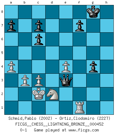 Last move : 0-1 2013 September 15 4:52:7 [Event "FICGS__CHESS__LIGHTNING_BRONZE__000452"] [Site "FICGS"] [Date "2013.09.15"] [Round "1"] [White "Schmid,Pablo"] [Black "Ortiz,Clodomiro"] [Result "0-1"] [WhiteElo "2002"] [BlackElo "2227"] 1.e4 e5 2.Nf3 Nc6 3.c3 d5 4.Qa4 Nf6 5.Nxe5 Bd6 6.Nxc6 bxc6 7.d3 O-O 8.Be2 Bg4 9.Bxg4 Nxg4 10.h3 Nxf2 11.Kxf2 Qh4+ 12.Ke2 Qg3 13.Rg1 dxe4 14.dxe4 Bc5 15.Rf1 Rad8 16.Qc4 Qxg2+ 17.Ke1 Rd7 18.Qxc5 Rfd8 19.Qh5 Rd1+ 20.Qxd1 Rxd1+ 21.Kxd1 Qxf1+ 22.Kc2 Qxh3 23.Nd2 h5 24.b3 h4 25.a4 Qe3 26.Ba3 h3 27.Rh1 g5 28.Bc5 Qxc5 29.Rxh3 Qg1 30.Rf3 g4 31.Rf1 Qe3 0-1 Ponziani : Leonhardt variation Kingside Castling by player Black (move 7) Player Black won this chess game. Follow this game move after move (download)Bobby Fischer's current state of mind is indeed a tragedy. One of the world's greatest Chess players - the pride and sorrow of American Chess. (Frank Brady) Im Hotelzimmer gab es nur zwei Schaben. (Über die Turnierbedingungen) (Peter Swidler) Una buena memoria, concentración, imaginación y una fuerte voluntad, se requiere para llegar a ser un buen jugador. (Bobby Fischer) RxDa4 pat (...) He who fights with monsters should be careful lest he thereby become a monster. (Friedrich Nietzsche, Beyond Good and Evil)