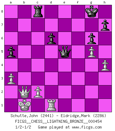 Last move : 1/2-1/2 2013 September 15 20:20:41 [Event "FICGS__CHESS__LIGHTNING_BRONZE__000454"] [Site "FICGS"] [Date "2013.09.15"] [Round "1"] [White "Schutte,John"] [Black "Eldridge,Mark"] [Result "1/2-1/2"] [WhiteElo "2441"] [BlackElo "2286"] 1.e4 c5 2.Nf3 d6 3.d4 cxd4 4.Nxd4 Nf6 5.Nc3 a6 6.Be3 e5 7.Nb3 Be6 8.h3 Be7 9.f4 exf4 10.Bxf4 O-O 11.Qf3 Qc7 12.g4 Nc6 13.O-O-O Rac8 14.g5 Nd7 15.Qg3 Nce5 16.Kb1 b5 17.Nd4 Nb6 18.a3 Rfe8 19.h4 Nec4 20.Rd3 Qc5 21.Nxe6 fxe6 22.Bh3 Bf8 23.Qg1 Qc6 24.Qf2 a5 25.Rf1 b4 26.Bg3 bxc3 27.Bxe6+ Kh8 28.Bxc8 Qxc8 29.Rxc3 g6 30.b3 Bg7 31.bxc4 Bxc3 32.Qxb6 Qxc4 33.Rd1 Qxe4 34.Bf2 Be5 35.Bd4 Rc8 36.Bxe5+ Qxe5 37.Qb2 Kg8 1/2-1/2 Sicilian : Najdorf, Byrne (English) attack Kingside Castling by player Black (move 10) Queenside Castling by player White (move 13) This chess game ended in a draw. Follow this game move after move (download)Nothing excites jaded Grandmasters more than a theoretical novelty. (Dominic Lawson) Auf Remis zu spielen ist gewissermaßen ein Verbrechen gegen das Schachspiel. (Mikhail Nekhemyevich Tal) El Ajedrez es tortura mental. (Garry Kasparov) Assurément je connaissais par expérience le mystérieux attrait de ce jeu royal, le seul entre tous les jeux inventés par les hommes qui échappe souverainement à la tyrannie du hasard, le seul où l'on ne doive sa victoire qu'à son intelligence ou plutôt à une certaine forme d'intelligence. Mais n'est-ce pas déjà le limiter injurieusement que d'appeler les échecs un jeu ? N'est-ce pas une science, un art ou quelque chose qui, comme le cercueil de Mahomet entre ciel et terre, est suspendu entre l'un et l'autre, et qui réunit un nombre incroyable de contraires ? [...] C'est une pensée qui ne mène à rien, une mathématique qui n'établit rien, un art qui ne laisse pas d'uvre, une architecture sans matière; et il l'a prouvé néanmoins qu'il était plus durable, à sa manière, que les livres ou que tout autre monument, ce jeu unique qui appartient à tous les peuples et à tous les temps, et dont personne ne sait quel dieu en fit don à la terre pour tuer l'ennui, pour aiguiser l'esprit et stimuler l'âme. Où commence-t-il, où finit-il ? (Stefan Zweig) Good luck. You're gonna need it. (Han Solo in Star Wars ep.6)