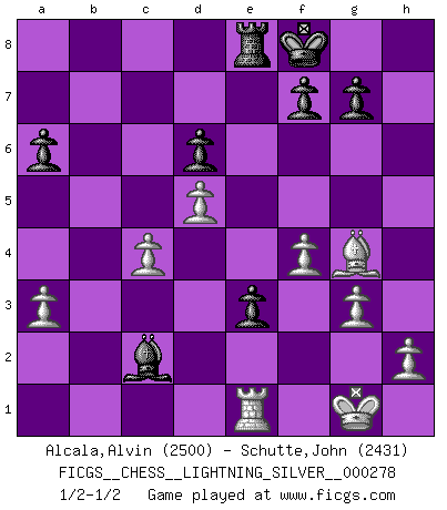 Last move : 1/2-1/2 2013 September 15 21:23:42 [Event "FICGS__CHESS__LIGHTNING_SILVER__000278"] [Site "FICGS"] [Date "2013.09.15"] [Round "1"] [White "Alcala,Alvin"] [Black "Schutte,John"] [Result "1/2-1/2"] [WhiteElo "2500"] [BlackElo "2431"] 1.e4 c5 2.Nf3 d6 3.d4 cxd4 4.Nxd4 Nf6 5.Nc3 a6 6.f3 e5 7.Nb3 Be6 8.Be3 h5 9.Qd2 Nbd7 10.a4 Qc7 11.Be2 Be7 12.a5 O-O 13.O-O Rac8 14.Rac1 Rfe8 15.Nd5 Nxd5 16.exd5 Bf5 17.c4 Nf6 18.Rfe1 h4 19.Qb4 h3 20.g3 e4 21.f4 Bd8 22.Bd4 Qd7 23.Rc3 Bg4 24.Bf1 Nh5 25.Nd2 Bf6 26.Bxf6 Nxf6 27.Rce3 Bf5 28.Nb3 Qc7 29.Nd4 Bg4 30.Rb3 Kf8 31.Qd2 Rb8 32.Nc2 Qc5+ 33.Ne3 b6 34.Ra3 bxa5 35.Qxa5 Qxa5 36.Rxa5 Bc8 37.Rb1 Rb3 38.Ra3 Rxa3 39.bxa3 Ng4 40.Nc2 e3 41.Bxh3 Bf5 42.Bxg4 Bxc2 43.Re1 1/2-1/2 Sicilian : Najdorf Kingside Castling by player Black (move 12) Kingside Castling by player White (move 13) This chess game ended in a draw. Follow this game move after move (download)Suddenly it was obvious to me in my analysis I had missed what Fischer had found with the greatest of ease at the board. (Mikhail Botvinnik) Der zweitbeste Zug ist oft der einzig richtige. (Savielly Grigorievitsch Tartakower) El Ajedrez moderno está demasiado preocupado con cosas como la estructura de Peones. Olvidenlo, el Jaque Mate termina la partida. (Nigel Short) Le profane ne songe pas à la somme de jouissance dont il se prive, qui méconnaît ce jeu aux ressources aussi variées que passionnantes. (Jean-Marie Jeanton-Lamarche) It is not titles that honor men, but men that honor titles. (Niccolo Machiavelli)
