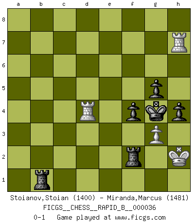 Last move : 0-1 2007 March 5 18:57:44 [Event "FICGS__CHESS__RAPID_B__000036"] [Site "FICGS"] [Date "2007.02.06"] [Round "1"] [White "Stoianov,Stoian"] [Black "Miranda,Marcus"] [Result "0-1"] [WhiteElo "1400"] [BlackElo "1481"] 1.e4 e5 2.Nf3 Nc6 3.d4 exd4 4.Nxd4 Bc5 5.Nb3 Bb6 6.Bc4 Nf6 7.O-O O-O 8.Nc3 d6 9.h3 Ne5 10.Be2 c6 11.Kh1 Be6 12.f4 Nc4 13.Nd2 Nxd2 14.Bxd2 Bd4 15.f5 Bd7 16.Bd3 Re8 17.a4 d5 18.exd5 cxd5 19.Bg5 Bc6 20.Qd2 Qb6 21.Ne2 Be5 22.Bxf6 Bxf6 23.c3 Rad8 24.a5 Qe3 25.Qxe3 Rxe3 26.Rfd1 d4 27.Nxd4 Bxd4 28.cxd4 Rxh3+ 29.Kg1 Rh4 30.d5 Rxd5 31.a6 h5 32.axb7 Bxb7 33.Rxa7 Rb4 34.Ra2 h4 35.Be2 Rxf5 36.Rd8+ Kh7 37.Bd3 Be4 38.Bxe4 Rxe4 39.b3 Re1+ 40.Kh2 R5f1 41.Kh3 Re3+ 42.Kh2 Rxb3 43.Rd4 g5 44.Rad2 f5 45.R4d3 R3b1 46.Rd7+ Kg6 47.R2d6+ Kh5 48.Rh7+ Kg4 49.Rd4+ f4 50.g3 Rf2+ 0-1 Scotch : Potter variation Kingside Castling by player White (move 7) Kingside Castling by player Black (move 7) 10 pieces endgame at move 42 : White KRRP , Black KRRPPP WHITE : King + 2 Rooks 1 Pawn BLACK : King + 2 Rooks 3 Pawns Player Black won this chess game. Follow this game move after move (download)In order to improve your game, you must study the endgame before everything else, for whereas the endings can be studied and mastered by themselves, the middle game and the opening must be studied in relation to the endgame. (Jose Raul Capablanca) Über Frauen: Chess is better. (Robert James Fischer) Bobby Fischer es el mas grande genio de Ajedrez de todos los tiempos. (Alexander Kotov) Il n'y a plus de joueurs du niveau de Jacob Murray dont la seule quête est le beau jeu, le plaisir de voir les pièces construire quelque chose. Sur 10 idées à la minute, 9 seront sans intérêt, la dernière s'avèrera géniale. (Christian Bauer) Man is reluctant to give credit for intelligence to anyone, except his enemies. (Albert Einstein)