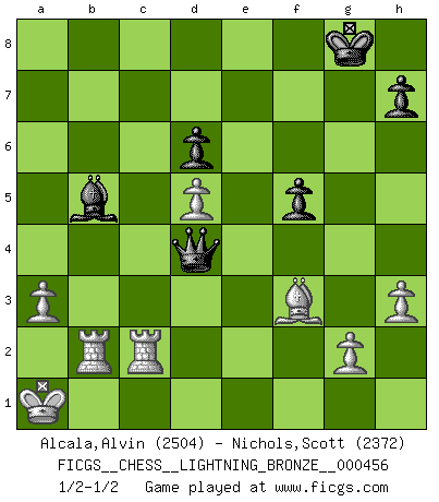 Last move : 1/2-1/2 2013 September 18 19:14:11 [Event "FICGS__CHESS__LIGHTNING_BRONZE__000456"] [Site "FICGS"] [Date "2013.09.18"] [Round "1"] [White "Alcala,Alvin"] [Black "Nichols,Scott"] [Result "1/2-1/2"] [WhiteElo "2504"] [BlackElo "2372"] 1.c4 Nf6 2.Nc3 g6 3.d4 Bg7 4.e4 d6 5.f3 O-O 6.Be3 e5 7.d5 Nh5 8.Qd2 Nd7 9.O-O-O f5 10.exf5 gxf5 11.Kb1 Qe7 12.Nh3 Nhf6 13.Rg1 e4 14.Nf2 Ne5 15.Be2 a6 16.h3 b5 17.cxb5 axb5 18.Bxb5 exf3 19.Nd3 f2 20.Nxf2 Bd7 21.Be2 Qf7 22.Bh6 Bxh6 23.Qxh6 Ra5 24.Qd2 Rfa8 25.Bf3 Rb8 26.Qf4 Rc5 27.Ka1 Qg7 28.Qc1 Be8 29.Nd3 Nxd3 30.Rxd3 Nd7 31.Re1 Ne5 32.Rd2 Nc4 33.Rc2 Bg6 34.Na4 Nxb2 35.Nxb2 Rxb2 36.Rxb2 Rxc1+ 37.Rxc1 Qd4 38.a3 Be8 39.Rxc7 Bb5 40.R7c2 1/2-1/2 English Opening Kingside Castling by player Black (move 5) Queenside Castling by player White (move 9) This chess game ended in a draw. Follow this game move after move (download)Chess books should be used as we use glasses: to assist the sight, although some players make use of them as if they thought they conferred sight. (Jose Raul Capablanca) Wenn sie aufgeben, dann danke ich Ihnen für das Spiel (Eventualzug beim Fernschach). (Anonymous) El Ajedrez no es como la vida... ¡tiene reglas!. (Mark Pasternak) Les échecs sont plus proches de l'art de l'assassinat que de l'art de la guerre. (Arturo Perez-Reverte) The only difference between a tax man and a taxidermist is that the taxidermist leaves the skin. (Mark Twain)