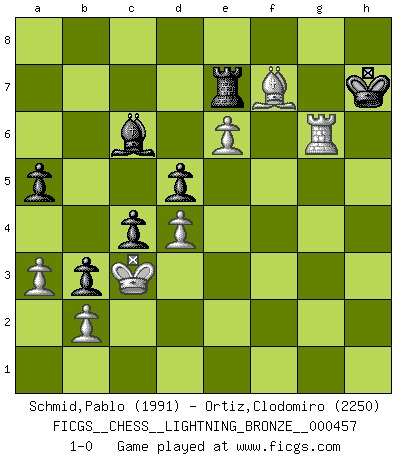 Last move : 1-0 2013 September 19 2:30:19 [Event "FICGS__CHESS__LIGHTNING_BRONZE__000457"] [Site "FICGS"] [Date "2013.09.18"] [Round "1"] [White "Schmid,Pablo"] [Black "Ortiz,Clodomiro"] [Result "1-0"] [WhiteElo "1991"] [BlackElo "2250"] 1.d4 Nf6 2.c4 e6 3.Nf3 d5 4.Nc3 c6 5.Bg5 h6 6.Bh4 dxc4 7.e4 g5 8.Bg3 b5 9.Be2 Bb7 10.O-O Nbd7 11.Ne5 h5 12.Nxd7 Qxd7 13.Qc1 Rg8 14.Rd1 Bb4 15.Qe3 Qe7 16.e5 Nd5 17.Nxd5 cxd5 18.Bxh5 Rh8 19.Be2 Ba5 20.a3 Bc6 21.Rf1 O-O-O 22.f4 gxf4 23.Rxf4 Rdg8 24.Qf2 Rh7 25.Bh4 Qf8 26.Bf6 Bd2 27.Rf3 Qh6 28.h4 Rg4 29.g3 Ba5 30.Rd1 Qg6 31.Bf1 Re4 32.Rf4 Rxf4 33.Qxf4 Qc2 34.Qc1 Qxc1 35.Rxc1 Bd7 36.Kf2 Bd8 37.Bd3 Rh5 38.Bxd8 Kxd8 39.Be2 Rh8 40.h5 Ke7 41.g4 a5 42.g5 Ra8 43.h6 Kf8 44.Ke3 Kg8 45.Rf1 b4 46.Bd1 Bb5 47.Bh5 Be8 48.Bg4 Kh7 49.Bd1 b3 50.Kd2 Ra7 51.Bg4 Rc7 52.Kc3 Rd7 53.Rf6 Re7 54.g6+ fxg6 55.Bxe6 Bc6 56.Bf7 Kxh6 57.Rxg6+ Kh7 58.e6 Bd7 59.Rf6 Bc6 60.Rg6 1-0 This chess game has been lost on time (started : 2013.09.18 21:41:55) Queen's pawn game Kingside Castling by player White (move 10) Queenside Castling by player Black (move 21) Player White won this chess game. Follow this game move after move (download)Place the contents of the Chess box in a hat, shake them up vigorously, pour them on the board from a height of two feet, and you get the style of Steinitz. (H. E. Bird) Habe Mut, dich deines eigenen Verstandes zu bedienen. (Immanuel Kant) Si yo gano un torneo, yo lo gano por mí mismo. Yo hago las jugadas. Nadie me ayuda. (Bobby Fischer) J'ai toujours senti une vague pitié pour l'homme qui ne connaît rien aux échecs, tout comme j'en aurais pour un homme ignorant de l'amour. Les Echecs, comme la musique ou comme l'amour, ont le pouvoir de rendre heureux. (Siegbert Tarrasch) Home computers are being called upon to perform many new functions, including the consumption of homework formerly eaten by the dog. (Doug Larson)