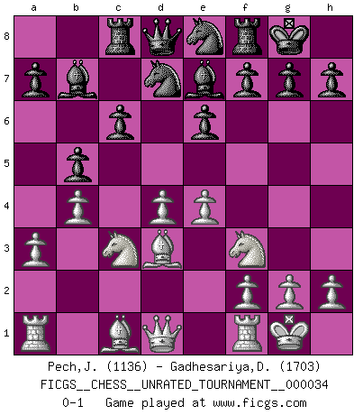 Last move : 0-1 2014 January 4 22:30:43 [Event "FICGS__CHESS__UNRATED_TOURNAMENT__000034"] [Site "FICGS"] [Date "2013.09.19"] [Round "1"] [White "Pech,Jaroslav senior"] [Black "Gadhesariya,Divyesh"] [Result "0-1"] [WhiteElo "1136"] [BlackElo "1703"] 1.d4 Nf6 2.c4 e6 3.Nc3 d5 4.Nf3 c6 5.e3 Nbd7 6.Bd3 dxc4 7.Bxc4 b5 8.Bd3 Bb7 9.O-O Rc8 10.a3 Be7 11.b4 O-O 12.e4 Ne8 0-1 This chess game has been lost on time (started : 2013.09.19 11:33:10) Queen's pawn game Kingside Castling by player White (move 9) Kingside Castling by player Black (move 11) Player Black won this chess game. Follow this game move after move (download)Fischer wanted to give the Russians a taste of their own medicine. (Larry Evans) Im Schach gewinnt jeder. Hat man Freunde am Spiel - und das ist die Hauptsache - ist auch der Verlust einer Partie kein Unglück. (David Bronstein) En manos de Fischer's, una diminuta ventaja teórica es tan buena como tener una Reina de ventaja. (Isaac Kashdan) Toutes les manuvres exécutées sur une colonne ouverte ont pour but ultime l'intrusion définitive sur la septième ou la huitième rangée, en plein cur de la position ennemie. (Aaron Nimzovitch) Life is pleasant. Death is peaceful. It's the transition that's troublesome. (Isaac Asimov)