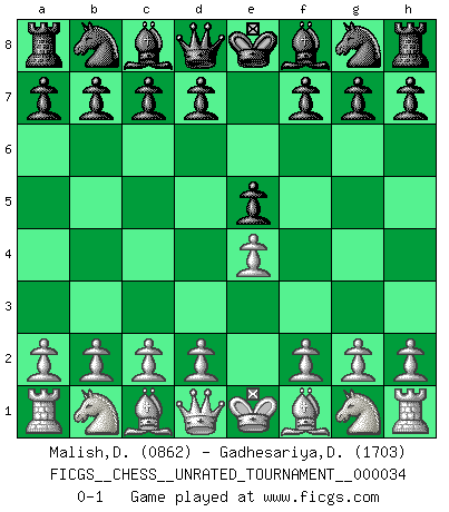 Last move : 0-1 2013 October 29 17:3:12 [Event "FICGS__CHESS__UNRATED_TOURNAMENT__000034"] [Site "FICGS"] [Date "2013.09.19"] [Round "1"] [White "Malish,Dmitriy"] [Black "Gadhesariya,Divyesh"] [Result "0-1"] [WhiteElo "0862"] [BlackElo "1703"] 1.e4 e5 0-1 This chess game has been lost on time (started : 2013.09.19 11:33:10) King's pawn game Player Black won this chess game. Follow this game move after move (download)What is the object of playing a gambit opening?... To acquire a reputation of being a dashing player at the cost of losing a game. (Siegbert Tarrasch) Immer nach dem besten Zug zu suchen ist ziemlich unpraktisch. (Nigel Short) ¿Que sería del Ajedrez sin errores graciosos?. (Kurt Richter) Le profane ne songe pas à la somme de jouissance dont il se prive, qui méconnaît ce jeu aux ressources aussi variées que passionnantes. (Jean-Marie Jeanton-Lamarche) There are more things in heaven and earth than practically anywhere else. (Unknown)