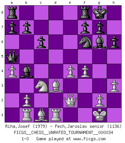 Last move : 1-0 2013 December 12 21:20:32 [Event "FICGS__CHESS__UNRATED_TOURNAMENT__000034"] [Site "FICGS"] [Date "2013.09.19"] [Round "1"] [White "Riha,Josef"] [Black "Pech,Jaroslav senior"] [Result "1-0"] [WhiteElo "1979"] [BlackElo "1136"] 1.d4 d5 2.c4 c6 3.Nf3 Nf6 4.Nc3 dxc4 5.a4 Bf5 6.e3 e6 7.Bxc4 Bb4 8.O-O O-O 9.Qe2 Nbd7 10.e4 Bg6 11.Bd3 h6 12.Rd1 Qe7 13.h3 e5 14.dxe5 Nxe5 15.Nxe5 Qxe5 16.f4 Qa5 17.Rb1 1-0 This chess game has been lost on time (started : 2013.09.19 11:33:10) QGD Slav : Dutch variation Kingside Castling by player White (move 8) Kingside Castling by player Black (move 8) Player White won this chess game. Follow this game move after move (download)Personally, I rather look forward to a computer program winning the world Chess Championship. Humanity needs a lesson in humility. (Richard Dawkings) Ich habe Putins Aufstieg an die Macht beobachtet und seine Politik, die demokratischen Institutionen meines Landes zu zerstören. (Garry Kasparov) El Peón aislado arroja penumbra sobre todo el tablero. (Aaron Nimzovich) Les Cavaliers se révèlent fort utiles dans les positions fermées. D'habitude, les Fous sont un peu plus forts que les Cavaliers dans les positions ouvertes. Qu'on le veuille ou non, il restera toujours des exceptions ! Fear is the path to the dark side. Fear leads to anger; anger leads to hate; hate leads to suffering. I sense much fear in you. (Master Yoda in Star Wars ep.1)