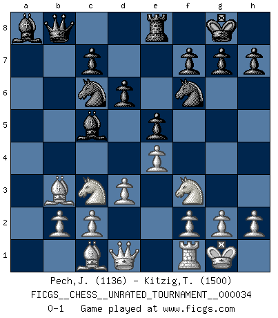 Last move : 0-1 2014 January 6 10:35:38 [Event "FICGS__CHESS__UNRATED_TOURNAMENT__000034"] [Site "FICGS"] [Date "2013.09.19"] [Round "1"] [White "Pech,Jaroslav senior"] [Black "Kitzig,Tobias"] [Result "0-1"] [WhiteElo "1136"] [BlackElo "1500"] 1.e4 e5 2.Nf3 Nc6 3.Bb5 a6 4.Ba4 b5 5.Bb3 Bb7 6.O-O Nf6 7.d3 Bc5 8.a4 O-O 9.Nc3 d6 10.axb5 axb5 11.Rxa8 Bxa8 12.Nxb5 Qb8 13.Nc3 Re8 0-1 This chess game has been lost on time (started : 2013.09.19 11:33:10) Ruy Lopez : Caro variation Kingside Castling by player White (move 6) Kingside Castling by player Black (move 8) Player Black won this chess game. Follow this game move after move (download)Chess, like love, is infectious at any age. (Flohr) Kostenjuk hat keinen Sexappeal. (Loek van Wely) Puntos débiles o agujeros en la posición de tu oponente deben de ser ocupados por piezas, no Peones. (Siegbert Tarrasch) Je fais ceci parce que dans cinquante coups j'obtiendrai cela; je m'appelle Mikhail Moisevitch Botvinnik. (Botvinnik) I live to kill Traxler counterattack. (Ilmars Cirulis)