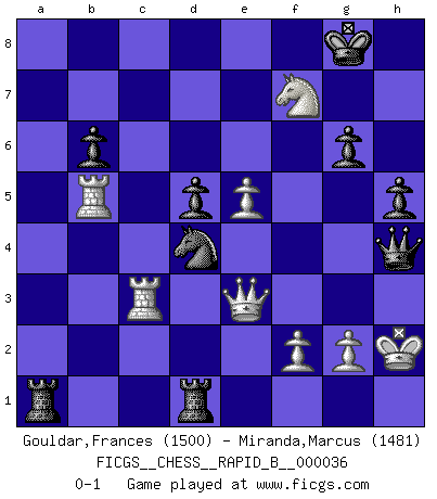 Last move : 0-1 2007 April 3 16:51:16 [Event "FICGS__CHESS__RAPID_B__000036"] [Site "FICGS"] [Date "2007.02.06"] [Round "1"] [White "Gouldar,Frances"] [Black "Miranda,Marcus"] [Result "0-1"] [WhiteElo "1500"] [BlackElo "1481"] 1.e4 e5 2.Nf3 Nc6 3.Bc4 Bc5 4.c3 Nf6 5.d4 exd4 6.e5 d5 7.Bb5 Ne4 8.cxd4 Bb6 9.O-O O-O 10.Be3 Ne7 11.Nbd2 Nxd2 12.Qxd2 c6 13.Be2 Ng6 14.Rad1 Bg4 15.h3 Bf5 16.Rfe1 Re8 17.Bg5 Qc8 18.Qc3 Bd8 19.Bxd8 Qxd8 20.Bd3 Bxd3 21.Qxd3 Nf4 22.Qf5 Ne6 23.Re3 a5 24.Qg4 g6 25.b3 Qe7 26.Rde1 a4 27.Rb1 axb3 28.Rexb3 Reb8 29.R1b2 Ra4 30.Rb6 c5 31.Qg3 c4 32.R6b5 Qd8 33.Qg4 b6 34.h4 h5 35.Qg3 Ra3 36.Rd2 Rba8 37.Rdb2 c3 38.Rc2 Rxa2 39.Rxc3 Ra1+ 40.Kh2 Rd1 41.Ng5 R8a1 42.Qe3 Nxd4 43.Nxf7 Qxh4+ 0-1 Giuoco Piano Kingside Castling by player White (move 9) Kingside Castling by player Black (move 9) Player Black won this chess game. Follow this game move after move (download)A player surprised is half beaten. (Proverb) Kasparov ist eine Art Monster mit hundert Augen, denen auch nicht das Geringste entgeht. (Tony Miles) Una buena ofensiva y una buena defensa, comienzan ambas con un buen desarrollo. (Bruce A. Moon) J'ai vu le vaincu d'Echecs jouer des années durant dans l'espoir de la fête de la victoire. Car tu es plus riche de ce qu'elle existe si même elle n'est point pour toi. Ainsi de la perle du fond des mers. (Antoine de Saint-Exupéry) Man is still the most extraordinary computer of all. (John F. Kennedy)