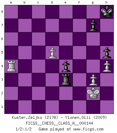 Last move : 1/2-1/2 2014 May 13 15:58:30 [Event "FICGS__CHESS__CLASS_A__000144"] [Site "FICGS"] [Date "2013.09.21"] [Round "1"] [White "Kuster,Zeljko"] [Black "Ylonen,Olli"] [Result "1/2-1/2"] [WhiteElo "2178"] [BlackElo "2009"] 1.b3 e5 2.Bb2 Nc6 3.e3 Nf6 4.c4 d5 5.cxd5 Nxd5 6.a3 Bd6 7.Qc2 O-O 8.Nf3 Qe7 9.d3 f5 10.Nbd2 Bd7 11.Be2 b5 12.O-O Kh8 13.g3 Nf6 14.Rfe1 Nd8 15.d4 e4 16.Ne5 Be8 17.a4 c6 18.Bf1 a5 19.Bg2 Bb4 20.axb5 cxb5 21.f3 Ra7 22.Rec1 Nd5 23.Nf1 Rc7 24.Qe2 Nc3 25.Qd2 exf3 26.Bxf3 Ne4 27.Rxc7 Qxc7 28.Qc1 Qe7 29.Ba3 Nf7 30.Nd3 Bxa3 31.Qxa3 Qxa3 32.Rxa3 a4 33.bxa4 bxa4 34.Bxe4 fxe4 35.Nc5 Ng5 36.Nd2 Bc6 37.h4 Nf3+ 38.Nxf3 Rxf3 39.Kg2 h5 40.Nxa4 Bxa4 41.Rxa4 Rxe3 42.d5 1/2-1/2 Nimzovich-Larsen attack : Modern variation Kingside Castling by player Black (move 7) Kingside Castling by player White (move 12) 10 pieces endgame at move 41 : White KRPPP , Black KRPPP WHITE : King + 1 Rook 3 Pawns BLACK : King + 1 Rook 3 Pawns This chess game ended in a draw. Follow this game move after move (download)Chess holds its master in its own bonds, shackling the mind and brain so that the inner freedom of the very strongest must suffer. (Albert Einstein) Die unerbitterlichsten Regeln im Schach sind die Ausnahmen. (Savielly Grigorievitsch Tartakower) La maestría del Ajedrez consiste esencialmente en analizar posiciónes de Ajedrez con precisión. (Mikhail Botvinnik) Tout change constamment, y compris dans le monde des Echecs. (Botvinnik) The quality of decision is like the well-timed swoop of a falcon which enables it to strike and destroy its victim. (Sun Tzu)