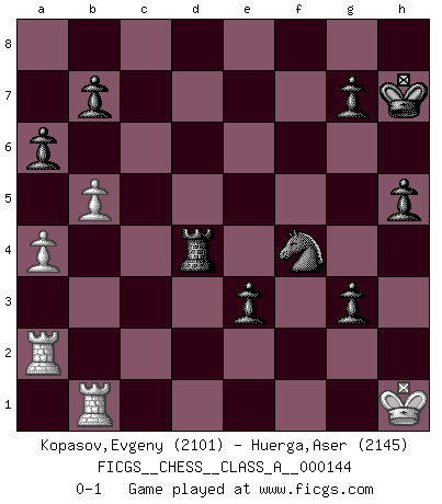 Last move : 0-1 2014 March 22 19:23:5 [Event "FICGS__CHESS__CLASS_A__000144"] [Site "FICGS"] [Date "2013.09.21"] [Round "1"] [White "Kopasov,Evgeny"] [Black "Huerga,Aser"] [Result "0-1"] [WhiteElo "2101"] [BlackElo "2145"] 1.d4 d5 2.Nf3 c6 3.Bf4 Bf5 4.e3 e6 5.c4 Bd6 6.Bg3 Nf6 7.Nc3 O-O 8.Bd3 dxc4 9.Bxc4 Bxg3 10.hxg3 Qb6 11.Qe2 c5 12.Rd1 cxd4 13.Nxd4 Bg6 14.f3 Nbd7 15.Kf2 a6 16.g4 h6 17.Bd3 Ne5 18.Bxg6 fxg6 19.Kg1 Rac8 20.g3 Nc4 21.b3 Ne5 22.Na4 Qd6 23.Kg2 Nexg4 24.e4 e5 25.Nf5 Qb4 26.Nb6 Qxb6 27.Ne7+ Kh7 28.Nxc8 Ne3+ 29.Kh2 Rxc8 30.Rc1 Rf8 31.Rhe1 Nfg4+ 32.Kh3 Nf2+ 33.Qxf2 Qe6+ 34.g4 Nxg4 35.Qe2 Nf6 36.Kh2 Nh5 37.Qe3 Nf4 38.Rc2 Rd8 39.Rf1 Rd3 40.Qf2 Qh3+ 41.Kg1 g5 42.Rb2 h5 43.Rc2 g4 44.Qh2 Rxf3 45.Qxh3 Nxh3+ 46.Kg2 Nf4+ 47.Kg1 Rg3+ 48.Kh1 Re3 49.b4 g3 50.Rb1 Rxe4 51.a4 Rd4 52.Ra2 e4 53.b5 e3 0-1 Queen's pawn game Kingside Castling by player Black (move 7) Player Black won this chess game. Follow this game move after move (download)Bobby Fischer is the greatest Chess genius of all time ! (Alexander Kotov) Die Partien sind immer verschieden, die Interviews immer die gleichen. (Garry Kasparov) No hay precio que sea tan grande por la cabellera del Rey enemigo. (Koblentz) Les Echecs représentent une sphère d'idées créatrices basée sur la volonté des deux protagonistes. (Smyslov) Gambling is the son of avarice and the father of despair. (French proverb)