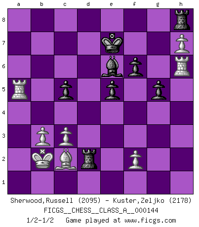 Last move : 1/2-1/2 2014 February 18 18:8:2 [Event "FICGS__CHESS__CLASS_A__000144"] [Site "FICGS"] [Date "2013.09.21"] [Round "1"] [White "Sherwood,Russell"] [Black "Kuster,Zeljko"] [Result "1/2-1/2"] [WhiteElo "2095"] [BlackElo "2178"] 1.e4 c5 2.Nf3 e6 3.d4 cxd4 4.Nxd4 Nf6 5.Nc3 d6 6.g4 h6 7.h4 e5 8.Nf5 Nc6 9.h5 Qa5 10.Bd2 Qb6 11.Ne3 Be7 12.Ned5 Nxd5 13.Nxd5 Qd8 14.c3 Be6 15.Be3 Rc8 16.Nxe7 Kxe7 17.Rg1 f6 18.g5 hxg5 19.Rxg5 Kf7 20.Rg1 d5 21.h6 g6 22.exd5 Qxd5 23.Qxd5 Bxd5 24.O-O-O Be6 25.Rd6 g5 26.Rh1 b6 27.Bb5 Nb8 28.a4 Rc7 29.Kc2 Bf5+ 30.Kc1 Ke7 31.R6d1 Nd7 32.Kd2 Nc5 33.Bxc5+ bxc5 34.Bd3 Be6 35.h7 Rb7 36.Kc1 Bb3 37.Be4 Rb6 38.Rd2 Bxa4 39.Bf5 Rb7 40.Be4 Rc7 41.Rh6 Bc6 42.Bf5 Rb7 43.b3 a5 44.Ra2 Ra7 45.Kb2 Bd5 46.Ra1 Be6 47.Be4 Ra6 48.Bd3 Rd6 49.Bc2 Rd2 50.Rxa5 1/2-1/2 Sicilian : Anderssen variation Queenside Castling by player White (move 24) This chess game ended in a draw. Follow this game move after move (download)There are tough players and nice guys, and I'm a tough player. (Bobby Fischer) Kann Schach nicht schließlich das Nationalspiel der Deutschen werden? Und welche weiteren Ausblicke bieten sich dann dar! Welche Hebung des allgemeinen Kultur-Niveaus, ja der Moral, wenn das Schachbrett den Kartentisch verdrängen würde! Wahrlich, ein Ziel, des Schweißes der Edlen wert! (Siegbert Tarrasch) No es una movida, aún la mejor movida que tu debas buscar, sino un plan comprensible. (Eugene Znosko-Borovsky) A chaque perte on perd un peu de soi. (Joël Lautier) I don't diet. I just don't eat as much as I'd like to. (Linda Evangelista, supermodel)