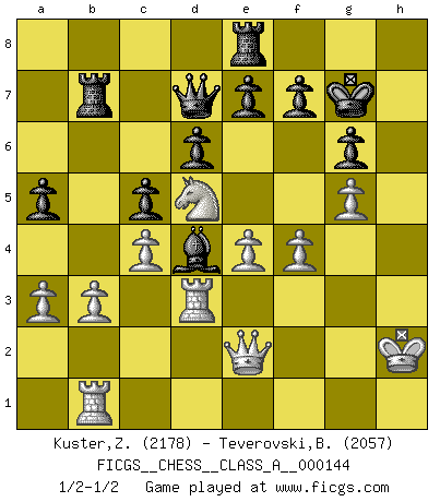 Last move : 1/2-1/2 2014 January 1 22:49:39 [Event "FICGS__CHESS__CLASS_A__000144"] [Site "FICGS"] [Date "2013.09.21"] [Round "1"] [White "Kuster,Zeljko"] [Black "Teverovski,Bogoljub"] [Result "1/2-1/2"] [WhiteElo "2178"] [BlackElo "2057"] 1.c4 Nf6 2.g3 g6 3.Bg2 Bg7 4.Nc3 d6 5.e4 O-O 6.Nge2 c5 7.O-O Nc6 8.d3 a6 9.h3 Rb8 10.Rb1 b5 11.a3 bxc4 12.dxc4 Be6 13.b3 Qc8 14.Kh2 Bd7 15.f4 Rd8 16.Be3 Rb7 17.Qd2 Be8 18.Rfd1 Qb8 19.Qa2 Rc8 20.g4 Nd7 21.Bf2 Nf8 22.Nd5 Ne6 23.g5 a5 24.h4 Bd7 25.Bh3 Re8 26.h5 Qc8 27.Rd3 Ned4 28.Nxd4 Nxd4 29.Bxd4 Bxd4 30.hxg6 hxg6 31.Bxd7 Qxd7 32.Qe2 Kg7 1/2-1/2 English, 1...Nf6 (Anglo-Indian defense) Kingside Castling by player Black (move 5) Kingside Castling by player White (move 7) This chess game ended in a draw. Follow this game move after move (download)You know you're going to lose. Even when I was ahead I knew I was going to lose. - On playing against Fischer. (Andrew Soltis) Mein Gehirn das ist mein zweitwichtigstes Organ [Aus dem Film: Der Schläfer]. (Woody Allen) Cada Peón es potencialmente una Reina. (James Mason) Comme les marins qui ont mille raisons différentes d'aller en mer, les joueurs d'échecs en ont tout autant avant de s'installer devant une table et jouer... (Vincent Bertignac, philosophe) There are two types of people in this world, good and bad. The good sleep better, but the bad seem to enjoy the waking hours much more. (Woody Allen)
