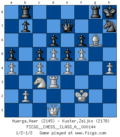 Last move : 1/2-1/2 2014 January 1 22:50:58 [Event "FICGS__CHESS__CLASS_A__000144"] [Site "FICGS"] [Date "2013.09.21"] [Round "1"] [White "Huerga,Aser"] [Black "Kuster,Zeljko"] [Result "1/2-1/2"] [WhiteElo "2145"] [BlackElo "2178"] 1.e4 g6 2.d4 Bg7 3.c4 d6 4.Nc3 Nf6 5.Nf3 O-O 6.Be2 e5 7.Be3 Ng4 8.Bg5 f6 9.Bh4 Nd7 10.O-O Nh6 11.Qd2 Nf7 12.Rad1 c6 13.Qc2 Re8 14.d5 Qc7 15.Nd2 a5 16.f3 Bh6 17.Bf2 c5 18.g3 Nf8 19.h4 Qd7 20.Ndb1 Bg7 21.Na3 h5 22.Nab5 Bh6 23.Rd3 Qe7 24.Be3 Bh3 25.Bxh6 Nxh6 26.Rf2 Kg7 27.Qd1 Bc8 28.g4 Rd8 29.gxh5 gxh5 30.f4 Ng4 31.f5 Nxf2 32.Kxf2 Kh8 33.Bxh5 Bd7 34.Nc7 Ba4 35.Nxa4 Qxc7 36.Bg6 Nh7 37.Nc3 Qe7 38.Ne2 Rab8 39.a4 Rg8 40.Nc3 1/2-1/2 Robatsch (Modern) defense Kingside Castling by player Black (move 5) Kingside Castling by player White (move 10) This chess game ended in a draw. Follow this game move after move (download)The isolated Pawn casts gloom over the entire chessboard. (Aaron Nimzovich) Der Verteidiger gebe der Gewalt nach, aber nur der Gewalt. Er schaffe sich nicht freiwillig, etwa aus Blindheit oder aus Schrecken, irgendwelche Schwächen. Er lasse sich nicht bluffen. (Emanuel Lasker) El juego del Ajedrez no es solamente una diversión quieta; algunas cualidades muy valuables de la mente se pueden adquirir y cultivar con el, como convertirlos en habitos disponibles para toda ocasión; ya que la vida es algo así como el Ajedrez. (Benjamin Franklin) Horreur, mais aussi harmonie suprême : qu'y avait-il en effet au monde en dehors des échecs ? Le brouillard, l'inconnu, le non-être... (Vladimir Nabokov) War is the child of passion, passion is the child of narcissism and narcissism is the child. (...) Another game ? (Thibault de Vassal)