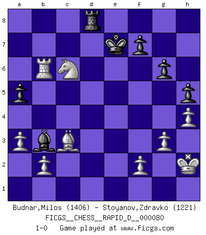 Last move : 1-0 2013 September 30 20:5:10 [Event "FICGS__CHESS__RAPID_D__000080"] [Site "FICGS"] [Date "2013.09.22"] [Round "1"] [White "Budnar,Milos"] [Black "Stoyanov,Zdravko"] [Result "1-0"] [WhiteElo "1406"] [BlackElo "1221"] 1.e4 c5 2.Nf3 a6 3.c3 Nc6 4.d4 cxd4 5.cxd4 e6 6.Nc3 h6 7.Bc4 Bb4 8.Bd2 Nge7 9.d5 exd5 10.Nxd5 O-O 11.Nxb4 Nxb4 12.Bxb4 Re8 13.O-O Nc6 14.Bc3 Rxe4 15.Bd5 Re8 16.Bxc6 dxc6 17.Qxd8 Rxd8 18.h3 Rd6 19.Rfd1 Rxd1+ 20.Rxd1 Be6 21.a3 Bd5 22.Nd4 g6 23.h4 h5 24.g3 b6 25.Rd2 Kf8 26.Nc2 Re8 27.Kh2 Bb3 28.Nb4 Rc8 29.Rd6 Ke7 30.Rxc6 Rd8 31.Rxb6 a5 32.Nc6+ 1-0 Sicilian : O'Kelly variation Kingside Castling by player Black (move 10) Kingside Castling by player White (move 13) Player White won this chess game. Follow this game move after move (download)Fischer wanted to give the Russians a taste of their own medicine. (Larry Evans) In der Schule lernt man nichts. Es ist nur Zeitverschwendung. (Robert James Fischer) Algunos sacrificios son sólidos, los demás son míos. (Mikhail Tal) Tous ces prétendus hommes politiques sont les pions, les Cavaliers, les Tours ou les Fous d'une partie d'échecs qui se jouera tant qu'un hasard ne renversera pas l'échiquier. (Honoré de Balzac) Any activity becomes creative when the doer cares about doing it right or doing it better. (John Updike)