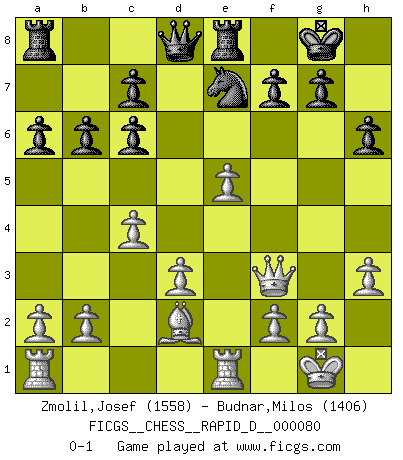 Last move : 0-1 2013 November 17 16:55:58 [Event "FICGS__CHESS__RAPID_D__000080"] [Site "FICGS"] [Date "2013.09.22"] [Round "1"] [White "Zmolil,Josef"] [Black "Budnar,Milos"] [Result "0-1"] [WhiteElo "1558"] [BlackElo "1406"] 1.e4 e5 2.Nf3 Nc6 3.Bb5 a6 4.Ba4 Nf6 5.O-O Be7 6.Re1 O-O 7.Bxc6 dxc6 8.Nxe5 Re8 9.Nf3 Bg4 10.d3 h6 11.h3 Bh5 12.Be3 Bb4 13.Nbd2 Bxf3 14.Qxf3 Bxd2 15.Bxd2 b6 16.e5 Nd5 17.c4 Ne7 0-1 Ruy Lopez : Closed defense Kingside Castling by player White (move 5) Kingside Castling by player Black (move 6) Player Black won this chess game. Follow this game move after move (download)A thorough understanding of the typical mating continuations makes the most complicated sacrificial combinations leading up to them not only not difficult, but almost a matter of course. (Siegbert Tarrasch) Bogoljubow: Matt in vier Zügen! Tartakower: Ich verbitte mir jede Belästigung! (Savielly Grigorievitsch Tartakower) La caracteristica mas importante en la posición del Ajedrez es la actividad de las piezas. Esto es absolutamente fundamental en todas las fases del juego: Apertura, Juego Medio y especialmente Finales. La limitación primordial en la actividad de una pieza, es la estructuración de los Peones. (Michael Stean) Le thème de l'attaque double intervient d'une manière ou d'une autre dans l'immense majorité des combinaisons. (Youri Averbakh) Unless in communicating with it one says exactly what one means, trouble is bound to result. (Alan Turing, about computers)