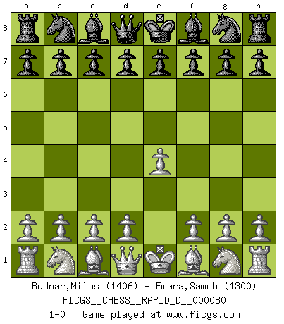 Last move : 1-0 2013 October 22 16:52:40 [Event "FICGS__CHESS__RAPID_D__000080"] [Site "FICGS"] [Date "2013.09.22"] [Round "1"] [White "Budnar,Milos"] [Black "Emara,Sameh"] [Result "1-0"] [WhiteElo "1406"] [BlackElo "1300"] 1.e4 1-0 This chess game has been lost on time (started : 2013.09.22 0:39:25) King's pawn Opening Player White won this chess game. Follow this game move after move (download)He who fears an isolated Queen's Pawn should give up Chess. (Siegbert Tarrasch) Das Zentrum ist der Balkan des Schachbretts - Kriegshandlungen können in jedem Moment ausbrechen. (Aaron Nimzowitsch) Las combinaciones han sido siempre el aspecto más intrigante del Ajedrez. Los Maestros las buscan, el público las aplauden, los críticos las alaban. La razón se debe a que las combinaciones hacen posible que el Ajedrez sea más que un ejercicio matemático con una carencia de vida. Ellas son la poesía del juego, son del Ajedrez lo que la melodía es de la música. Ellas representan el triunfo de la mente sobre la materia. (Reuben Fine) Il s'avisa de me proposer d'apprendre les échecs qu'il jouait un peu... me voilà forcené des échecs. J'achète un échiquier, je m'enferme dans ma chambre, j'y passe des jours et des nuits à vouloir apprendre par cur toutes les parties. (Jean-Jacques Rousseau, Confessions) Watch your thoughts; they become words. Watch your words; they become actions. Watch your actions; they become habits. Watch your habits; they become character. Watch your character; it becomes your destiny. (Frank Outlaw)
