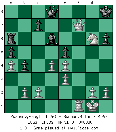 Last move : 1-0 2013 December 5 11:47:37 [Event "FICGS__CHESS__RAPID_D__000080"] [Site "FICGS"] [Date "2013.09.22"] [Round "1"] [White "Puzanov,Vasyl"] [Black "Budnar,Milos"] [Result "1-0"] [WhiteElo "1426"] [BlackElo "1406"] 1.e4 e5 2.Nf3 Nc6 3.Bb5 a6 4.Ba4 Nf6 5.Nc3 b5 6.Bb3 Be7 7.O-O O-O 8.d3 h6 9.Be3 Ng4 10.a4 b4 11.Nd5 a5 12.Bc4 Ba6 13.Bxa6 Rxa6 14.d4 Nxe3 15.fxe3 f6 16.Nh4 Bd6 17.Qg4 Ne7 18.Nxf6+ Kh8 19.Nxd7 Rxf1 20.Rxf1 Ng8 21.Ng6+ Kh7 22.Qf5 Nf6 23.Ne7 Kh8 24.Nxf6 gxf6 25.Qxf6+ Kh7 26.Qf7+ Kh8 27.Ng6+ 1-0 Ruy Lopez : Four knights (Tarrasch) variation Kingside Castling by player White (move 7) Kingside Castling by player Black (move 7) Player White won this chess game. Follow this game move after move (download)Chess is a terrific way for kids to build self image and self esteem. (Saudin Robovic) Ohne Leiden bildet sich kein Charakter. (Ernst Freiherr von Feuchtersleben) Yo tuve un dolor de muelas en la primer partida. En el segundo juego, tuve un dolor de cabeza. En el tercero, tuve un ataque de reumatísmo. En la cuarta partida, no me sentía muy bien. ¿Y en el quinto juego? Bueno, ¿que acaso uno tiene que ganar todos los juegos?. (Siegbert Tarrasch) D'abord les bases : Jouez et étudiez, puis étudiez et jouez, ensuite jouez et étudiez, puis étudiez et jouez. Deuxièmement : Donnez toujours le meilleur de vous-même ! (Ken Smith) To err is human, but to really foul things up requires a computer. (Farmer's Almanac, 1978)