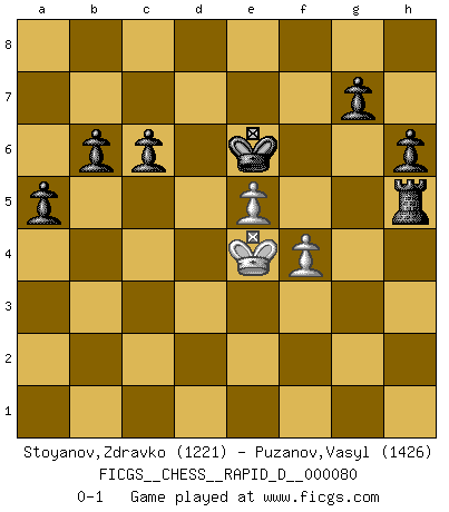 Last move : 0-1 2013 December 2 18:48:11 [Event "FICGS__CHESS__RAPID_D__000080"] [Site "FICGS"] [Date "2013.09.22"] [Round "1"] [White "Stoyanov,Zdravko"] [Black "Puzanov,Vasyl"] [Result "0-1"] [WhiteElo "1221"] [BlackElo "1426"] 1.e4 e5 2.Nf3 Nc6 3.Bb5 a6 4.Bxc6 dxc6 5.h3 Bc5 6.d3 Qd6 7.O-O Nf6 8.Bg5 h6 9.Bh4 Nh5 10.Nbd2 Be6 11.c3 Nf4 12.Bg3 Nxd3 13.Qc2 O-O-O 14.Rad1 f5 15.exf5 Bxf5 16.Qb3 Qf6 17.Nc4 e4 18.Nd4 Bxd4 19.cxd4 Be6 20.Bxc7 Kxc7 21.Qb6+ Kb8 22.Na5 Bc8 23.f3 Qxd4+ 24.Qxd4 Rxd4 25.fxe4 Rhd8 26.b3 Be6 27.Rf3 Ne5 28.Rxd4 Nxf3+ 29.gxf3 Rxd4 30.h4 Kc7 31.Kf1 b6 32.Nc4 Bxc4+ 33.bxc4 Rxc4 34.h5 Ra4 35.Kf2 Rxa2+ 36.Ke3 Ra5 37.Kf4 Rxh5 38.e5 Kd7 39.Ke4 Ke6 40.f4 a5 0-1 Ruy Lopez : Exchange variation Kingside Castling by player White (move 7) Queenside Castling by player Black (move 13) 10 pieces endgame at move 37 : White KPP , Black KRPPPPP WHITE : King + 2 Pawns BLACK : King + 1 Rook 5 Pawns Player Black won this chess game. Follow this game move after move (download)The boy (then a 12 year old boy named Anatoly Karpov) doesn't have a clue about Chess, and there's no future at all for him in this profession. (Mikhail Botvinnik) Das Schachspiel hat wie die Liebe, die Musik, die Fähigkeit, den Menschen glücklich zu machen. Ich habe ein leises Gefühl des Bedauerns für jeden, der das Schachspiel nicht kennt, so wie ich jeden bedaure, der die Liebe nicht kennt. (Siegbert Tarrasch) Coloca el contenido del tablero de Ajedrez en un sombrero, agita las piezas vigorosamente, derrámalas en el tablero desde una altura de medio metro y así obtienes el estilo de Wilhelm Steinitz. (H. E. Bird) On n'a jamais que l'âge auquel on a commence à jouer aux échecs car après on cesse de vieillir. (Capablanca) There is a great deal of difference between an eager man who wants to read a book and a tired man who wants a book to read. (G.K. Chesterton)