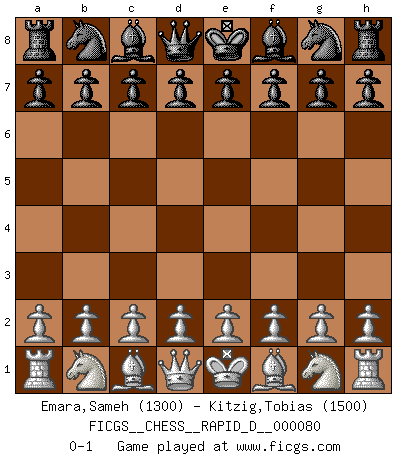 Last move : 0-1 2013 October 22 4:53:32 [Event "FICGS__CHESS__RAPID_D__000080"] [Site "FICGS"] [Date "2013.09.22"] [Round "1"] [White "Emara,Sameh"] [Black "Kitzig,Tobias"] [Result "0-1"] [WhiteElo "1300"] [BlackElo "1500"] 0-1 This chess game has been lost on time (started : 2013.09.22 0:39:25) Player Black won this chess game. Follow this game move after move (download)Combinations have always been the most intriguing aspect of Chess. The masters look for them, the public applauds them, the critics praise them. It is because combinations are possible that Chess is more than a lifeless mathematical exercise. They are the poetry of the game; they are to Chess what melody is to music. They represent the triumph of mind over matter. (Reuben Fine) Alles was am Schachbrett zählt sind gute Züge. (Robert James Fischer) Botvinnik trató de alejar el misterio referente al Ajedrez, siempre relacionandolo a situaciones de la vida diaria. Solía llamar al Ajedrez un problema inexacto típico, similar a aquellos en que la gente tiene siempre que resolver a cada día. (Garry Kasparov) Soyez une menace à chaque fois que vous vous asseyez pour jouer. (Ken Smith) They say in chess you've got to kill the queen, and then you mate it... Oh I, do you ? (Red Hot Chili Peppers, Fortune faded)