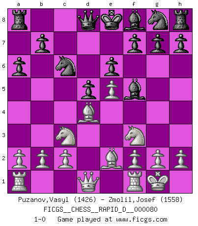 Last move : 1-0 2013 November 20 2:45:32 [Event "FICGS__CHESS__RAPID_D__000080"] [Site "FICGS"] [Date "2013.09.22"] [Round "1"] [White "Puzanov,Vasyl"] [Black "Zmolil,Josef"] [Result "1-0"] [WhiteElo "1426"] [BlackElo "1558"] 1.e4 c6 2.d4 d5 3.e5 Bf5 4.Nf3 e6 5.Be2 c5 6.O-O Nc6 7.Nc3 a6 8.Be3 cxd4 9.Bxd4 1-0 Caro-Kann : Advance variation Kingside Castling by player White (move 6) Player White won this chess game. Follow this game move after move (download)My style is somewhere between that of Tal and Petrosian. (Reshevsky) Karpov ist ein Museumsstück. (Garry Kasparov) El hombre es un frívolo, una creatura engañosa y como un jugador de Ajedrez, se preocupa mas por el proceso de obtener su meta que de la meta por sí misma. (Dostoyevsky) Si je n'étais pas joueur d'échecs, je serais le meilleur dans quelque chose d'autre. (Anatoli Karpov) When I took office, only high energy physicists had ever heard of what is called the World Wide Web... Now even my cat has its own page. (Bill Clinton, 1996)