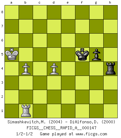 Last move : 1/2-1/2 2013 November 4 20:18:51 [Event "FICGS__CHESS__RAPID_A__000147"] [Site "FICGS"] [Date "2013.09.22"] [Round "1"] [White "Simashkevitch,Mykola"] [Black "DiAlfonso,Darren"] [Result "1/2-1/2"] [WhiteElo "2004"] [BlackElo "2000"] 1.e4 c5 2.Nf3 d6 3.d4 cxd4 4.Nxd4 Nf6 5.Nc3 a6 6.Be3 e5 7.Nb3 Be6 8.f3 h5 9.Qd2 Nbd7 10.Nd5 Nxd5 11.exd5 Bf5 12.Be2 Qh4+ 13.g3 Qf6 14.Na5 Rb8 15.O-O-O Be7 16.Kb1 Bd8 17.h3 Bg6 18.Qb4 O-O 19.g4 Rc8 20.Rc1 Nc5 21.Nb3 b6 22.Qa3 Qe7 23.gxh5 Bxh5 24.Rhg1 Qc7 25.Rg2 Nxb3 26.Qxb3 b5 27.Rcg1 g6 28.Qd3 Bf6 29.Qe4 Rfe8 30.Bd3 Qd7 31.Bh6 Qe7 32.h4 Rb8 33.Bc1 Rbc8 34.Bg5 Kf8 35.Bh6+ Bg7 36.Bxg7+ Kxg7 37.Rg5 Qa7 38.Qf5 b4 39.R5g2 Rh8 40.f4 Qd4 41.fxe5 Qxe5 42.Qf2 Rce8 43.Rf1 f5 44.Rg5 Qe3 45.Qxe3 Rxe3 46.Bxf5 Rhe8 47.R5g1 Rf8 48.b3 Re5 49.Be6 Re4 50.a3 a5 51.axb4 axb4 52.Kb2 Rxh4 53.Ra1 Rh2 54.Ra7+ Kh6 55.Ra6 Rd8 56.Rb6 Rh4 57.Ra1 g5 58.Ra4 Kg6 59.R6xb4 Rxb4 60.Rxb4 Kf6 61.Kc3 Rf8 62.Bg4 Rh8 63.Bxh5 Rxh5 64.Rg4 Ke5 65.b4 Kxd5 66.Kb3 Ke5 67.Ka4 d5 68.c3 Kf5 69.Rg1 Rh2 70.Rb1 Rh4 71.Ka5 d4 72.cxd4 1/2-1/2 Sicilian : Najdorf, Byrne (English) attack Queenside Castling by player White (move 15) Kingside Castling by player Black (move 18) 10 pieces endgame at move 63 : White KRBPPP , Black KRPP WHITE : King + 1 Rook 1 Bishop 3 Pawns BLACK : King + 1 Rook 2 Pawns 9 pieces endgame at move 63 : White KRPPP , Black KRPP WHITE : King + 1 Rook 3 Pawns BLACK : King + 1 Rook 2 Pawns 8 pieces endgame at move 65 : White KRPP , Black KRPP WHITE : King + 1 Rook 2 Pawns BLACK : King + 1 Rook 2 Pawns 7 pieces endgame at move 72 : White KRPP , Black KRP WHITE : King + 1 Rook 2 Pawns BLACK : King + 1 Rook 1 Pawn This chess game ended in a draw. Follow this game move after move (download)Methodical thinking is of more use in Chess than inspiration. (C. J. S. Purdy) Nur ein wirklich starker Spieler weiß wie schwach er spielt. (Savielly Grigorievitsch Tartakower) Es el objetivo de la escuela moderna no tratar cada posición de acuerdo a una regla general, sino de acuerdo al principio inherente en la posición. (Richard Reti) C'est la seule position que je connaisse où les deux camps sont mals. Propos prêtés à V. Anand. 98% of all statistics are made up. (Author unknown)