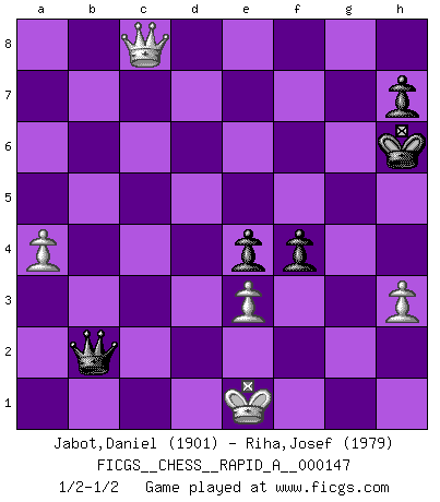 Last move : 1/2-1/2 2013 December 12 11:37:22 [Event "FICGS__CHESS__RAPID_A__000147"] [Site "FICGS"] [Date "2013.09.22"] [Round "1"] [White "Jabot,Daniel"] [Black "Riha,Josef"] [Result "1/2-1/2"] [WhiteElo "1901"] [BlackElo "1979"] 1.e4 e5 2.Nf3 Nc6 3.Bb5 a6 4.Ba4 Nf6 5.O-O Be7 6.Re1 b5 7.Bb3 O-O 8.h3 Bb7 9.a4 d5 10.exd5 Na5 11.Ba2 e4 12.Ne5 b4 13.c4 c6 14.d4 cxd5 15.Be3 dxc4 16.Nxc4 Nxc4 17.Bxc4 Nd5 18.Nd2 Rc8 19.Bb3 Nxe3 20.fxe3 g6 21.Rc1 Rxc1 22.Qxc1 Kg7 23.Re2 f5 24.g3 Qb8 25.Qe1 Rf6 26.Bc4 Qd8 27.Rg2 Qd7 28.b3 Qc7 29.Bf1 a5 30.Nc4 Bd5 31.Rc2 Rc6 32.Qf2 Bd6 33.Nxd6 Qxd6 34.Rxc6 Qxc6 35.Qf4 Bxb3 36.Qe5+ Qf6 37.Qc7+ Kh6 38.Qxa5 Qd6 39.Kf2 Bd5 40.Qb5 g5 41.Bc4 Bxc4 42.Qxc4 f4 43.gxf4 gxf4 44.Qc5 Qxc5 45.dxc5 b3 46.c6 b2 47.c7 b1Q 48.c8Q Qb2+ 49.Ke1 1/2-1/2 Ruy Lopez : Closed, 7...O-O Kingside Castling by player White (move 5) Kingside Castling by player Black (move 7) 10 pieces endgame at move 45 : White KPPPP , Black KPPPP WHITE : King + 4 Pawns BLACK : King + 4 Pawns Promotion Queen by player Black (move 47) Promotion Queen by player White (move 48) This chess game ended in a draw. Follow this game move after move (download)Don't even mention losing to me. I can't stand to think of it. (Bobby Fischer) Ich hatte meine größten Erfolge, als ich 47 Jahre alt war. Kasparow war noch nicht mal 42 und hat das Schach schon im Stich gelassen. (Viktor Kortschnoi) Bobby es la celebridad menos entendida y malinterpretada que camina el la faz de esta tierra. (Yasser Seirawan) Ce qui caractérise les parties de combat, c'est que si le défenseur a constamment de difficiles problèmes à résoudre, l'attaquant doit chercher sans relâche de nouvelles possibilités d'attaque. (Koblentz) Once you start thinking you have nothing left to learn, you have everything to learn. (Steve Badget)