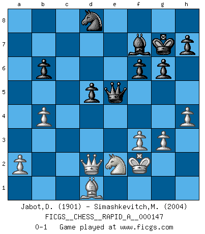 Last move : 0-1 2014 January 24 11:50:21 [Event "FICGS__CHESS__RAPID_A__000147"] [Site "FICGS"] [Date "2013.09.22"] [Round "1"] [White "Jabot,Daniel"] [Black "Simashkevitch,Mykola"] [Result "0-1"] [WhiteElo "1901"] [BlackElo "2004"] 1.e4 e5 2.Nf3 Nc6 3.Bb5 Nf6 4.O-O Nxe4 5.Re1 Nd6 6.Nxe5 Be7 7.Bf1 Nxe5 8.Rxe5 O-O 9.Nc3 Ne8 10.Nd5 Bd6 11.Re1 c6 12.Ne3 Bc7 13.d4 d5 14.Ng4 Nd6 15.Ne5 Bf5 16.c3 Re8 17.Bf4 f6 18.Nd3 Rxe1 19.Nxe1 Qd7 20.Bd3 Be6 21.Rc1 Bg4 22.f3 Be6 23.Rc2 Re8 24.Re2 g6 25.Nc2 Nc4 26.Bc1 Qd6 27.g3 Qd7 28.Qe1 Kg7 29.b3 Nd6 30.Bf4 Bf7 31.Ne3 Nb5 32.Bxc7 Nxc7 33.Qd2 Be6 34.Nd1 b6 35.Nf2 Qd6 36.Kg2 c5 37.dxc5 Qxc5 38.Bc2 Qa3 39.Bd1 Qd6 40.h4 a5 41.Re1 Qc6 42.Nd3 Bf7 43.Rxe8 Qxe8 44.Nf4 Qe7 45.Ne2 Qe5 46.Kf2 Ne6 47.b4 axb4 48.cxb4 Nd8 0-1 This chess game has been lost on time (started : 2013.09.22 20:15:12) Ruy Lopez : Berlin defense, Open variation Kingside Castling by player White (move 4) Kingside Castling by player Black (move 8) Player Black won this chess game. Follow this game move after move (download)Only sissies Castle. (Rob Sillars) Im Fernschach kannst du während dem Spiel rauchen. (John Christen Knudsen) La partida mas dura de ganar es una partida ganada. (Emanuel Lasker) Je ne crois pas en la psychologie, je crois aux bons coups. (Robert Fischer) Before all elsed, be armed. (Niccolo Machiavelli)