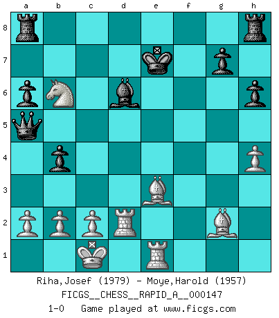 Last move : 1-0 2013 November 27 17:26:40 [Event "FICGS__CHESS__RAPID_A__000147"] [Site "FICGS"] [Date "2013.09.22"] [Round "1"] [White "Riha,Josef"] [Black "Moye,Harold"] [Result "1-0"] [WhiteElo "1979"] [BlackElo "1957"] 1.e4 c5 2.Nf3 d6 3.d4 cxd4 4.Nxd4 Nf6 5.Nc3 a6 6.Be3 e6 7.f3 b5 8.Qd2 Nbd7 9.g4 h6 10.O-O-O b4 11.Nce2 Qc7 12.h4 d5 13.Bg2 dxe4 14.g5 Nd5 15.g6 Ne5 16.gxf7+ Kxf7 17.fxe4 Nc4 18.exd5 Nxd2 19.dxe6+ Bxe6 20.Nxe6 Kxe6 21.Nf4+ Kd7 22.Rxd2+ Bd6 23.Nd5 Qa5 24.Nb6+ Ke7 25.Re1 1-0 Sicilian : Najdorf, Byrne (English) attack Queenside Castling by player White (move 10) Player White won this chess game. Follow this game move after move (download)Chess is in its essence a game, in its form an art, and in its execution a science. (Baron Tassilo) Zu meiner Zeit war ein 20 jähriger ein junger Spieler, heute ist er ein Veteran. (Garry Kasparov) Si pudieramos observar el interior de la cabeza de un jugador de Ajedrez, encontraríamos ahí un mundo lleno de sentimientos, imágenes, ideas, emoción y pasión. (Alfred Binet) La vérité est comme le meilleur coup aux échecs : elle existe, mais il faut la chercher. (Arturo Perez-Reverte) When you stop learning you start dying. (Scott Adams)