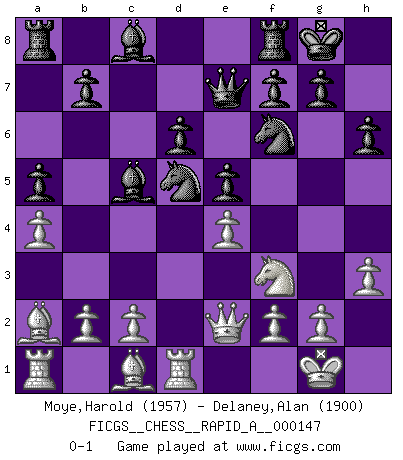 Last move : 0-1 2013 December 15 9:39:50 [Event "FICGS__CHESS__RAPID_A__000147"] [Site "FICGS"] [Date "2013.09.22"] [Round "1"] [White "Moye,Harold"] [Black "Delaney,Alan"] [Result "0-1"] [WhiteElo "1957"] [BlackElo "1900"] 1.e4 d6 2.d4 Nf6 3.Nc3 e5 4.Nf3 Nbd7 5.Bc4 Be7 6.O-O O-O 7.a4 c6 8.Qe2 a5 9.Rd1 Qe8 10.h3 Bd8 11.Be3 Qe7 12.Ra3 Bc7 13.d5 Bb6 14.Bg5 h6 15.Bc1 Bc5 16.Ra1 Nb6 17.Ba2 cxd5 18.Nxd5 Nbxd5 0-1 This chess game has been lost on time (started : 2013.09.22 20:15:12) Pirc defense Kingside Castling by player White (move 6) Kingside Castling by player Black (move 6) Player Black won this chess game. Follow this game move after move (download)If your opponent offers you a draw, try to work out why he thinks he's worse off. (Nigel Short) Ich habe die Schachforschung dermaßen betrieben, dass sie auf eine wissenschaftliche Basis gestellt wurde. (Mikhail Moiseyevich Botvinik) El hombre es un frívolo, una creatura engañosa y como un jugador de Ajedrez, se preocupa mas por el proceso de obtener su meta que de la meta por sí misma. (Dostoyevsky) J'ai vu le vaincu d'Echecs jouer des années durant dans l'espoir de la fête de la victoire. Car tu es plus riche de ce qu'elle existe si même elle n'est point pour toi. Ainsi de la perle du fond des mers. (Antoine de Saint-Exupéry) There are two major products that came out of Berkeley: LSD and UNIX. We do not believe this is to be a coincidence. (Jeremy S. Anderson)
