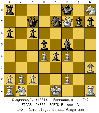 Last move : 1-0 2013 September 26 6:37:59 [Event "FICGS__CHESS__RAPID_E__000113"] [Site "FICGS"] [Date "2013.09.23"] [Round "1"] [White "Stoyanov,Zdravko"] [Black "Barradas,Anderson"] [Result "1-0"] [WhiteElo "1221"] [BlackElo "1174"] 1.e4 c6 2.Nf3 d5 3.exd5 cxd5 4.h3 Nc6 5.Bb5 a6 6.Bxc6+ bxc6 7.Ne5 Qc7 8.d4 e6 9.Qf3 Bd6 10.Bf4 Ne7 11.Nxf7 Bxf4 12.Nxh8 Kf8 13.g3 e5 14.gxf4 e4 15.Qh5 Bf5 16.Qf7+ 1-0 Caro-Kann defense Player White won this chess game. Follow this game move after move (download)The King is a fighting piece. Use it ! (Wilhelm Steinitz) Der zweitbeste Zug ist oft der einzig richtige. (Savielly Grigorievitsch Tartakower) El tablero es el mundo, las piezas es el fenomeno del universo, las reglas del juego son lo que llamamos leyes de la naturaleza y el jugador del lado opuesto, se encuentra oculto a nuestra vista. (Thomas Huxley) La tactique est l'élément le plus important du milieu de jeu. (Siegbert Tarrasch) A person who never made a mistake never tried anything new. (Albert Einstein)