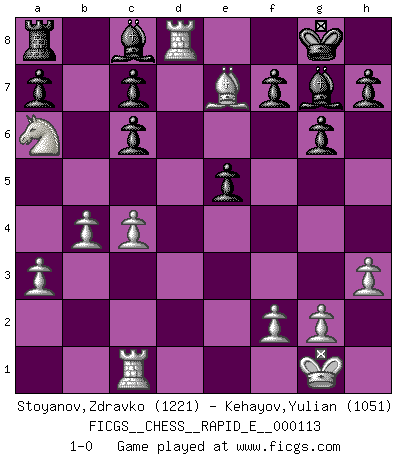 Last move : 1-0 2013 September 27 18:15:33 [Event "FICGS__CHESS__RAPID_E__000113"] [Site "FICGS"] [Date "2013.09.23"] [Round "1"] [White "Stoyanov,Zdravko"] [Black "Kehayov,Yulian"] [Result "1-0"] [WhiteElo "1221"] [BlackElo "1051"] 1.e4 e5 2.Nf3 d6 3.h3 g6 4.a3 Bg7 5.Be2 Nf6 6.c3 O-O 7.O-O d5 8.d3 dxe4 9.dxe4 Qxd1 10.Rxd1 Nxe4 11.Ng5 Nxg5 12.Bxg5 Nc6 13.Bf3 Na5 14.Nd2 Rb8 15.b4 Nc6 16.Bxc6 bxc6 17.Ne4 Bf5 18.Ng3 Be6 19.Rac1 Rb5 20.c4 R5b8 21.Ne4 Ra8 22.Nc5 Rfe8 23.Na6 Re7 24.Bxe7 Bc8 25.Rd8+ 1-0 Philidor's defense Kingside Castling by player Black (move 6) Kingside Castling by player White (move 7) Player White won this chess game. Follow this game move after move (download)It's just you and your opponent at the board and you're trying to prove something. (Bobby Fischer) Ich glaube nicht an Psychologie, ich glaube an gute Züge. (Robert James Fischer) Cuando no sepas que mover, espera por una idea que se le venga a la la cabeza de tu oponente. Tenlo por seguro de que esa idea estará incorrecta. (Siegbert Tarrasch) La solitude du joueur d'Echecs à l'approche du mat est semblable à celle du condamné. (Francis Szpiner) For to win one hundred victories in one hundred battles is not the acme of skill. To subdue the enemy without fighting is the acme of skill. (Sun Tzu)