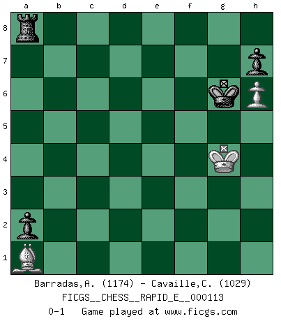 Last move : 0-1 2013 September 24 21:42:35 [Event "FICGS__CHESS__RAPID_E__000113"] [Site "FICGS"] [Date "2013.09.23"] [Round "1"] [White "Barradas,Anderson"] [Black "Cavaille,Cedric"] [Result "0-1"] [WhiteElo "1174"] [BlackElo "1029"] 1.e4 e5 2.Nf3 Nc6 3.Bb5 d6 4.O-O Bd7 5.Bxc6 Bxc6 6.d3 Be7 7.Nc3 Nf6 8.h3 O-O 9.Ne2 d5 10.Nxe5 dxe4 11.Nxc6 bxc6 12.Ng3 exd3 13.cxd3 Qd4 14.Nf5 Qd7 15.Qg4 Nxg4 16.hxg4 g6 17.Nh6+ Kg7 18.g5 Qxd3 19.Be3 f6 20.Rad1 Qe4 21.Rfe1 Qb4 22.Bd2 Qc5 23.b4 Qd6 24.Bc3 Qxd1 25.Rxd1 Rfd8 26.Re1 Re8 27.Ng4 Kf7 28.gxf6 Bd6 29.Nh6+ Kf8 30.Rxe8+ Kxe8 31.f7+ Kd7 32.a3 a6 33.g4 c5 34.f3 cxb4 35.axb4 c5 36.bxc5 Bxc5+ 37.Kg2 a5 38.f4 a4 39.f5 gxf5 40.Nxf5 a3 41.Kh3 a2 42.Ba1 Bf8 43.g5 Ke6 44.Nh6 Bxh6 45.gxh6 Kxf7 46.Kg4 Kg6 0-1 Ruy Lopez : Old Steinitz defense Kingside Castling by player White (move 4) Kingside Castling by player Black (move 8) 10 pieces endgame at move 40 : White KBNPP , Black KRBPP WHITE : King + 1 Bishop 1 Knight 2 Pawns BLACK : King + 1 Rook 1 Bishop 2 Pawns 9 pieces endgame at move 44 : White KBPP , Black KRBPP WHITE : King + 1 Bishop 2 Pawns BLACK : King + 1 Rook 1 Bishop 2 Pawns 8 pieces endgame at move 45 : White KBPP , Black KRPP WHITE : King + 1 Bishop 2 Pawns BLACK : King + 1 Rook 2 Pawns 7 pieces endgame at move 45 : White KBP , Black KRPP WHITE : King + 1 Bishop 1 Pawn BLACK : King + 1 Rook 2 Pawns Player Black won this chess game. Follow this game move after move (download)Chess is a foolish expedient for making idle people believe they are doing something very clever when they are only wasting their time. (George Bernard Shaw) Ich tröste mich mit dem Vergnügen, daß Schachfans, Zuschauer und Leser glücklich sind, wenn ein Großmeister etwas riskiert, statt nur Klötzchen zu schieben. (Mikhail Nekhemyevich Tal) Si pudieramos observar el interior de la cabeza de un jugador de Ajedrez, encontraríamos ahí un mundo lleno de sentimientos, imágenes, ideas, emoción y pasión. (Alfred Binet) Il n'y a pas de prix trop élevé au scalp de l'ennemi. (Koblentz) Wisdom is the reward you get for a lifetime of listening when you'd have preferred to talk. (Doug Larson)