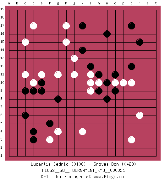 Last move : 0-1 2007 April 6 10:7:6 [Event "FICGS__GO__TOURNAMENT_KYU__000021"] [Site "FICGS"] [Date "2007.02.06"] [Round "1"] [Black "Lucantis,Cedric"] [White "Groves,Don"] [Result "0-1"] [Rating 1 "0100"] [Rating 2 "0423"] 1.q17 q3 2.d4 d17 3.k17 q10 4.q12 k4 5.r15 c15 6.c9 h17 7.n16 f3 8.d3 c11 9.c6 r6 10.e10 d10 11.d9 e11 12.e9 g11 13.k14 h15 14.o11 j11 15.l12 j13 16.f5 g4 17.g8 l11 18.m11 l10 19.o9 o10 20.n10 p10 21.m9 l9 22.n8 m10 0-1 This go game has been lost on time (started : 2007.02.06 18:13:13) Here are the names of the openings (joseki) played in the four corners : Player White won this Go (weiqi, baduk) game. Follow this game move after move (download)Don't disturb symmetry. (Anonymous) The hypothalamus is one of the most important parts of the brain, involved in many kinds of motivation, among other functions. The hypothalamus controls the 'Four Fs: Fighting, Fleeing, Feeding and Mating. (Unknown author)