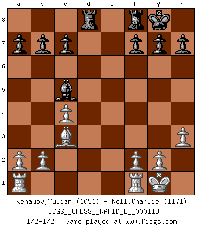 Last move : 1/2-1/2 2013 October 12 23:53:50 [Event "FICGS__CHESS__RAPID_E__000113"] [Site "FICGS"] [Date "2013.09.23"] [Round "1"] [White "Kehayov,Yulian"] [Black "Neil,Charlie"] [Result "1/2-1/2"] [WhiteElo "1051"] [BlackElo "1171"] 1.e4 e5 2.Nf3 Nc6 3.Be2 Nf6 4.O-O d5 5.exd5 Nxd5 6.Bc4 Nf6 7.Ng5 Nd5 8.Nf3 Be6 9.d3 Be7 10.Bd2 O-O 11.h3 Nd4 12.Nxd4 exd4 13.c3 dxc3 14.Nxc3 Nxc3 15.Bxc3 Bxc4 16.dxc4 Bc5 17.Qxd8 Raxd8 1/2-1/2 Inverted Hungarian Kingside Castling by player White (move 4) Kingside Castling by player Black (move 10) This chess game ended in a draw. Follow this game move after move (download)You know you're going to lose. Even when I was ahead I knew I was going to lose. - On playing against Fischer. (Andrew Soltis) Privat ist Kortschnoi kein schlechter Mensch, sehr sympathisch. Aber während des Spiels ist er grausam. Er will dich töten. (Miguel Najdorf) Una compensación adecuada por un sacrificio es tener una combinación sólida que conduce a una posición ganadora; una compensación adecuada por una metida de pata es dejar a tu oponente arrebatar una derrota de las fauces de la victoria. (Bruce A. Moon) Même si vous avez un bon coup à faire, regardez toujours s'il n'y en a pas un qui lui soit préférable. (Pedro Damiano) For peace of mind, resign as general manager of the universe. (Douglas Adams)