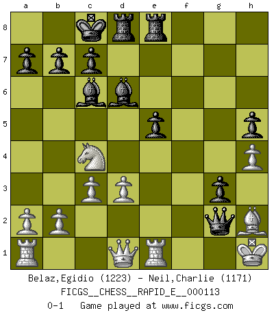 Last move : 0-1 2013 October 24 23:20:38 [Event "FICGS__CHESS__RAPID_E__000113"] [Site "FICGS"] [Date "2013.09.23"] [Round "1"] [White "Belaz,Egidio"] [Black "Neil,Charlie"] [Result "0-1"] [WhiteElo "1223"] [BlackElo "1171"] 1.e4 e5 2.Nf3 Nc6 3.Nc3 Nf6 4.Bc4 Nxe4 5.Nxe4 d5 6.Bd3 dxe4 7.Bxe4 Qf6 8.O-O Bd7 9.d3 Bd6 10.Bg5 Qe6 11.c3 f6 12.Bh4 O-O-O 13.Re1 g5 14.Bg3 h5 15.h4 g4 16.Nh2 f5 17.Bxc6 Bxc6 18.Nf1 Qd5 19.Ne3 Qf7 20.Nc4 f4 21.Bh2 Rhe8 22.Kf1 g3 23.fxg3 fxg3 24.Kg1 Qf2+ 25.Kh1 Qxg2+ 0-1 Four knights : Italian variation Kingside Castling by player White (move 8) Queenside Castling by player Black (move 12) Player Black won this chess game. Follow this game move after move (download)I am the best player in the world and I am here to prove it. (Bobby Fischer) Ich könnte leicht behaupten: Ja,ja, Leonid Breschnew wollte nicht, daß ich Weltmeister werde. In der Tat war die Sache komplizierter. (Viktor Kortschnoi) El arma más poderosa en el Ajedrez, es tener la próxima movida. (David Bronstein) Les réformistes prétendent que les progrès de la théorie conduiront à la disparition des échecs, et qu'il faut, pour leur rendre vie, en remanier les règles. En réalité, qu'exprime cette affirmation? Le mépris de l'intuition, de l'imagination et de tous les autres éléments qui font des échecs un art. (Alexander Alekhine) Train yourself to let go of everything you fear to lose. (Master Yoda in Star Wars ep.3)