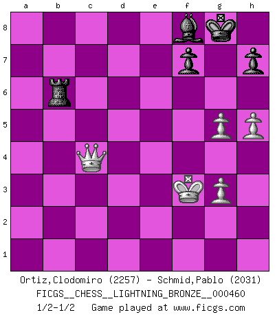 Last move : 1/2-1/2 2013 September 24 0:10:11 [Event "FICGS__CHESS__LIGHTNING_BRONZE__000460"] [Site "FICGS"] [Date "2013.09.23"] [Round "1"] [White "Ortiz,Clodomiro"] [Black "Schmid,Pablo"] [Result "1/2-1/2"] [WhiteElo "2257"] [BlackElo "2031"] 1.d4 d5 2.c4 c6 3.Nc3 e6 4.e3 Nf6 5.Nf3 Nbd7 6.Qc2 Bd6 7.Bd3 O-O 8.O-O dxc4 9.Bxc4 b5 10.Be2 Bb7 11.Rd1 Qc7 12.e4 e5 13.Bg5 exd4 14.Rxd4 Ne5 15.Bxf6 gxf6 16.g3 b4 17.Nb1 c5 18.Rd1 Nxf3+ 19.Bxf3 c4 20.Nd2 c3 21.bxc3 bxc3 22.Rac1 Rac8 23.Nf1 f5 24.Ne3 Ba3 25.Rb1 fxe4 26.Bg4 Rcd8 27.Bf5 Bb2 28.Bxe4 Bxe4 29.Qxe4 Rfe8 30.Qg4+ Kh8 31.Rxd8 Rxd8 32.Qe4 Kg8 33.Re1 Qc5 34.Qg4+ Kh8 35.Qf4 Qe7 36.Nc2 Qf8 37.Qf6+ Kg8 38.Re4 Rd1+ 39.Kg2 Qa8 40.Qg5+ Kf8 41.Qe5 Kg8 42.f3 Rd2+ 43.Kh3 Qc8+ 44.Rg4+ Qxg4+ 45.fxg4 Rxc2 46.Qg5+ Kf8 47.Qc5+ Kg7 48.Qd4+ Kg8 49.Qxa7 Rd2 50.a4 Ba3 51.Qb8+ Bf8 52.Qc8 c2 53.g5 Re2 54.a5 Re5 55.Qxc2 Rxa5 56.Kg4 Rb5 57.h4 Rb4+ 58.Kf3 Rd4 59.Qb3 Rb4 60.Qd5 Rb6 61.h5 Rd6 62.Qe4 Re6 63.Qc4 Rb6 64.Qd3 Rd6 65.Qe3 Re6 66.Qc3 Rb6 67.Qc4 Re6 68.Qc7 Re7 69.Qc3 Re6 70.Qd4 Rd6 71.Qc4 Rb6 1/2-1/2 QGD Slav defense Kingside Castling by player Black (move 7) Kingside Castling by player White (move 8) 10 pieces endgame at move 55 : White KQPPP , Black KRBPP WHITE : King + 1 Queen 3 Pawns BLACK : King + 1 Rook 1 Bishop 2 Pawns This chess game ended in a draw. Follow this game move after move (download)Chess problems demand from the composer the same virtues that characterize all worthwhile art: originality, invention, conciseness, harmony, complexity, and splendid insincerity. (Vladimir Nabokov) Der Partner hat auch seine Existenzberechtigung. (Savielly Grigorievitsch Tartakower) Mi estilo es algo parecido entre un poco de Tal y Petrosian. (Reshevsky) Celui qui prend des risques peut perdre, celui qui n'en prend pas perd toujours. (Xavier Tartacover) Whenever people agree with me, I always feel I must be wrong. (Oscar Wilde)